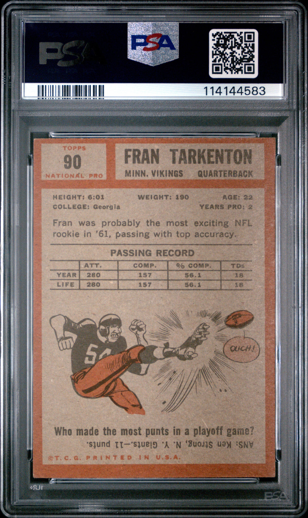 1962 Topps Fran Tarkenton Rookie #90 PSA 4 Minnesota Vikings HOF Don’t miss your chance to own this iconic 1962 Topps Fran Tarkenton Rookie Card #90, professionally graded PSA 4! This vintage collectible is a must-have for serious football card collectors and Minnesota Vikings fans, featuring Hall of Famer Fran Tarkenton’s legendary rookie card in solid condition. With only 401 graded and 1215 in higher grade, this card is a standout piece for any collection and a true conversation starter. Certified by Professional Sports Authenticator (PSA) with certification number 114144583, this card offers authenticity and peace of mind for collectors. Add this rare rookie card to your collection today and celebrate one of football’s all-time greats! Set: 1962 Topps Certification Number: 114144583 Grader: Professional Sports Authenticator (PSA) Player/Athlete: Fran Tarkenton Grade: 4 Year Manufactured: 1962 Graded: Yes Sport: Football Population Higher: 1215 Manufacturer: Topps Population: 401 Features: Rookie Team: Minnesota Vikings Card Number: 90 Listed With Mascot.