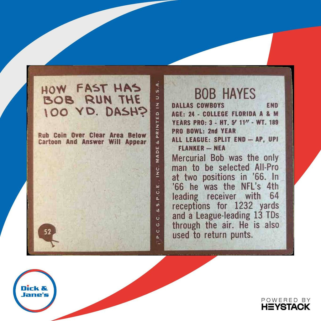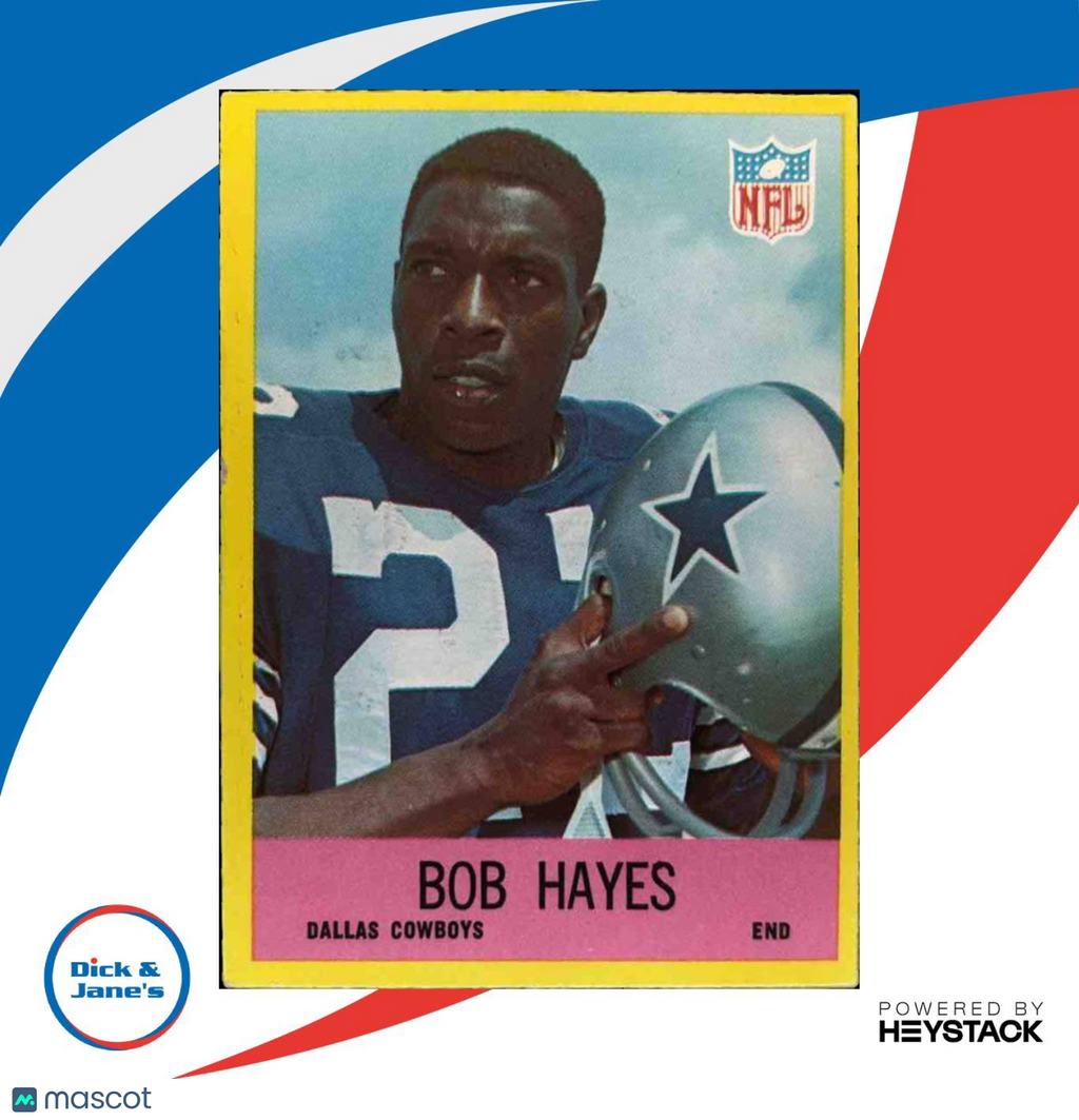 Rare 1967 Philadelphia Bob Hayes #52 NFL trading card featuring the legendary Dallas Cowboys player. This highly sought-after card is a must-have for any serious football card collector. Don't miss your chance to own a piece of NFL history with this iconic Bob Hayes card. Listed With Mascot.
