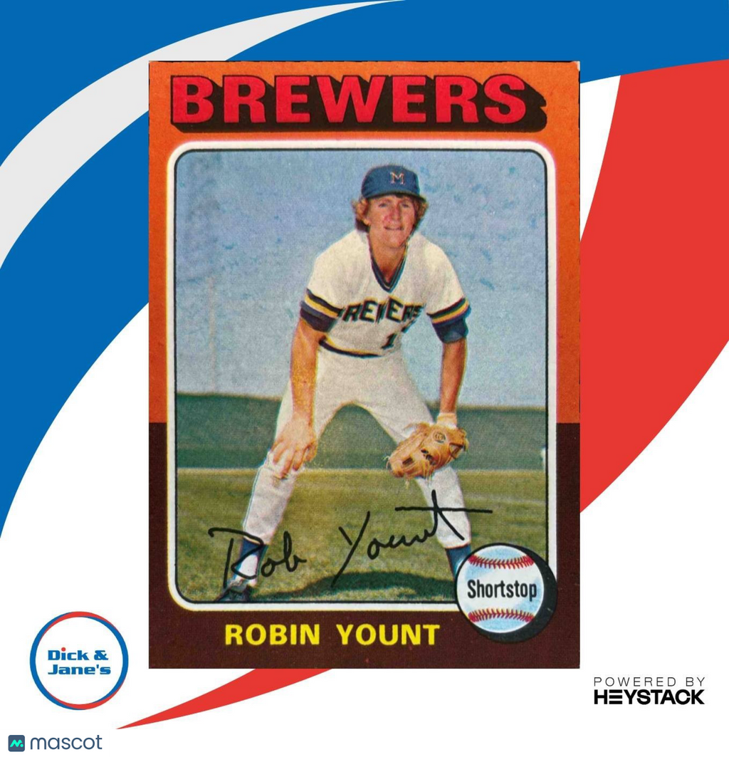 : This 1975 Topps Robin Yount #223 RC trading card features the MLB rookie card of the Milwaukee Brewers legend. A must-have for any baseball card collector, this iconic collectible showcases Yount in his early years, making it a prized possession for fans and enthusiasts alike. Don't miss your chance to own a piece of baseball history with this rare gem. Listed With Mascot.