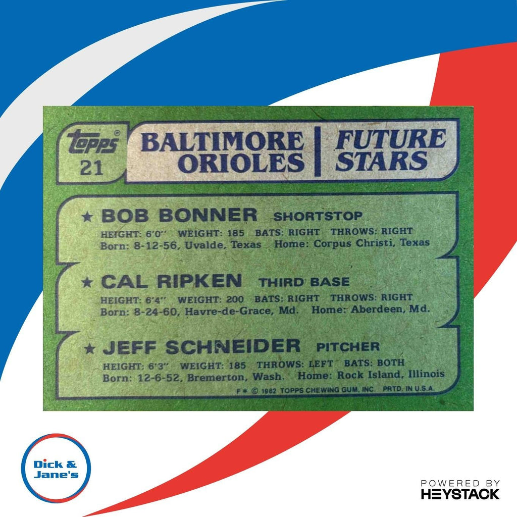 The 1982 Topps Future Stars card features rookie players Bob Bonner, Cal Ripken, and Jeff Schneider from the Baltimore Orioles. This MLB card is a valuable addition to any collection, showcasing the beginning of Ripken's legendary career. Don't miss out on this rare find! Listed With Mascot.