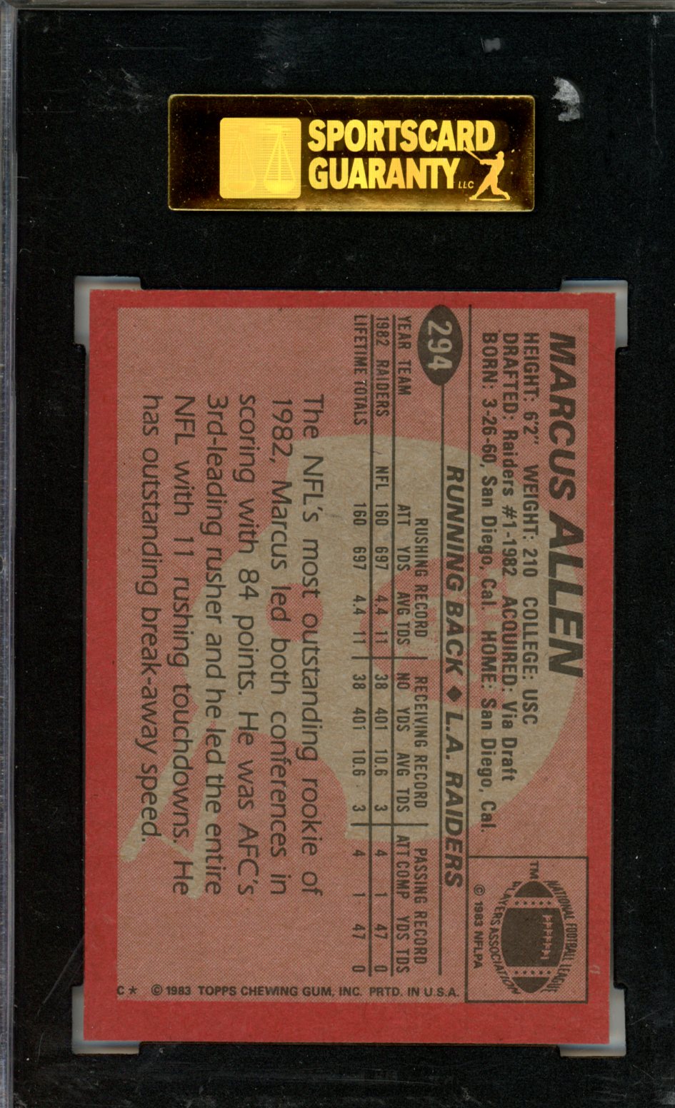 You are purchasing the following: 1983 Topps Marcus Allen Rookie #294 SGC 7.5 Oakland Raiders. You will receive the exact item in the photographs. Note: Please do not connact us and asking the following: 1. What is the lowest you would take? Just make an offer. If the offer is automatically declined, you have your answer. 2. What the best you can do? See above. Not repling to an email is a reply. 3. Any room on this? See above. Not repling to an offer is a reply. 4. We ONLY do one counter offer, so please make your best offer the first time! Note: If the price off, in your option, please send your resaoning and an offer. We will review it. Note: We manage nearly 10 millon cards regularly and will adjust prices as errors are noticed or pointed out! Listed With Mascot.