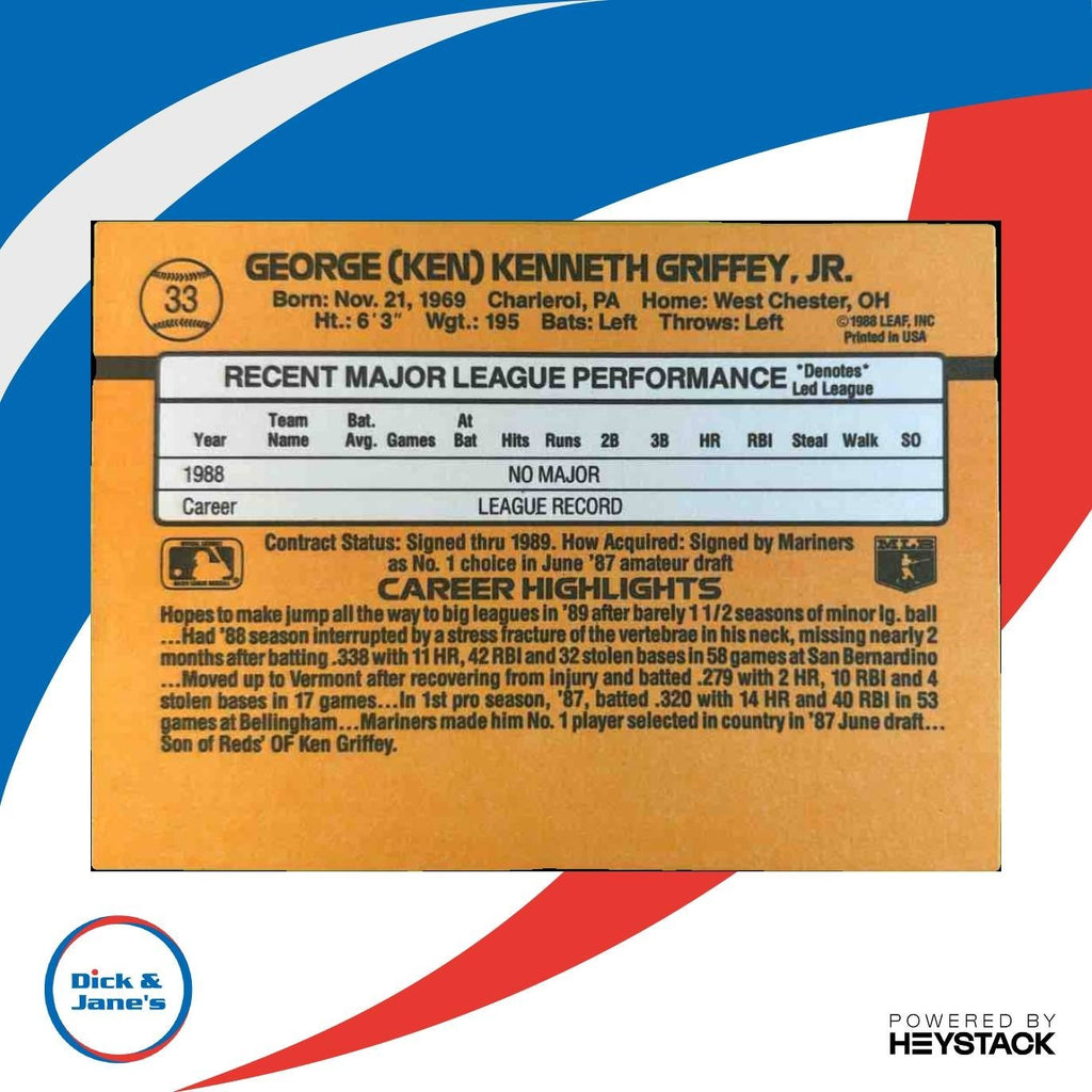 This 1989 Donruss Ken Griffey Jr. #33 RC Rated Rookie trading card features the Seattle Mariners MLB star in his rookie year. A must-have for any baseball card collector, this card showcases Griffey's talent and potential as one of the game's future legends. Don't miss out on adding this iconic card to your collection! Listed With Mascot.