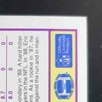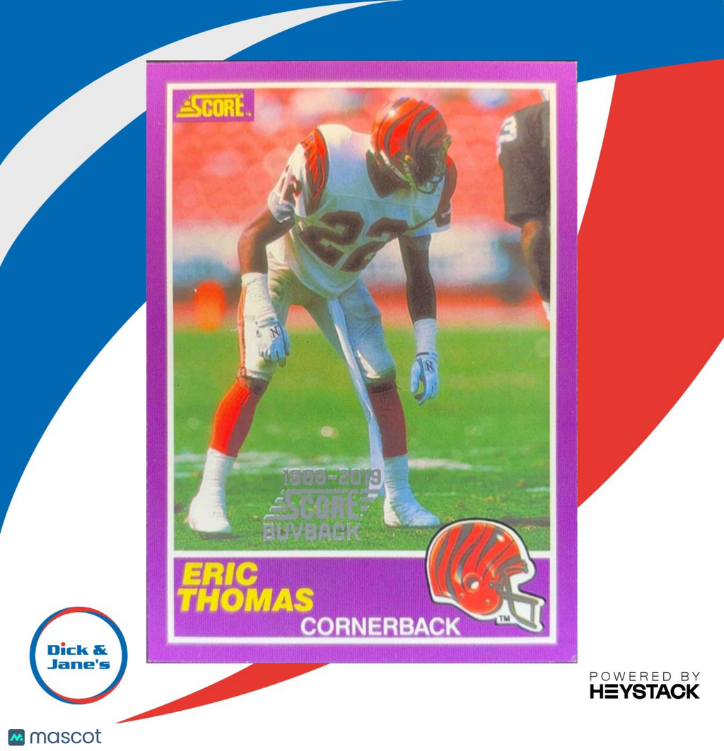 . Highly sought-after 1989 Score Supplemental card featuring rookie player Eric Thomas from the Cincinnati Bengals. This buyback stamped card is a must-have for any NFL trading card collector. Don't miss out on this rare and valuable piece of football memorabilia. Get your hands on it now! Listed With Mascot.