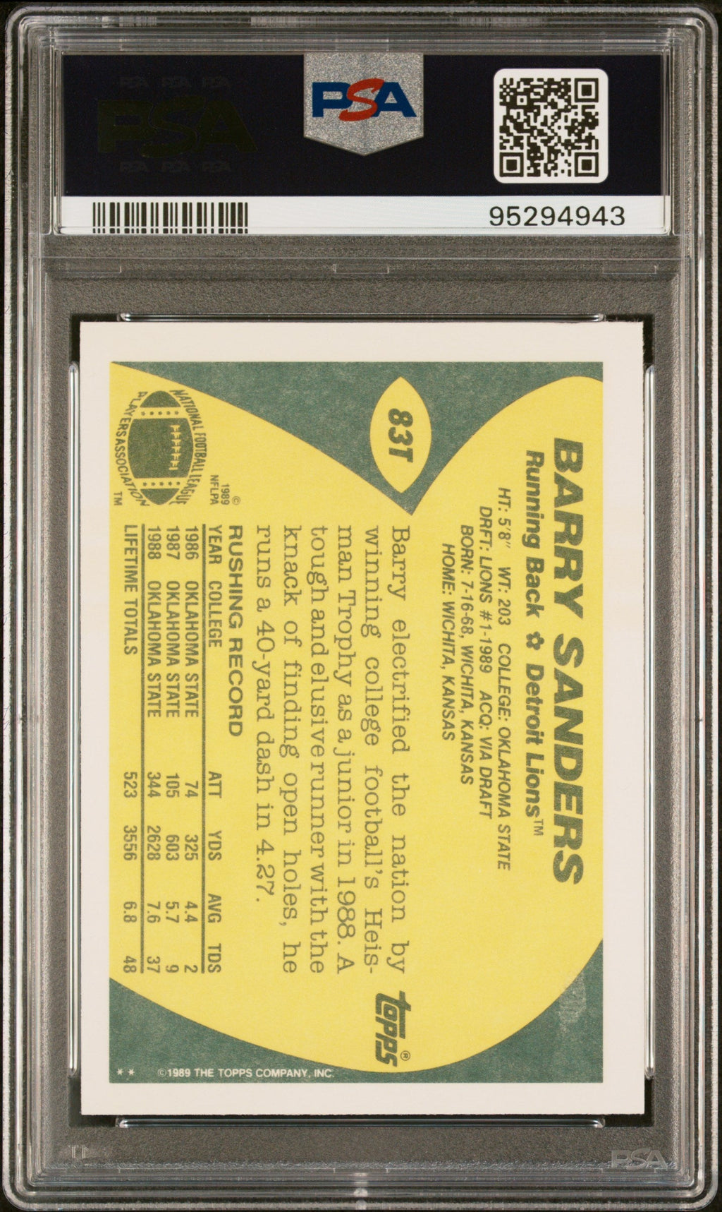 1989 Topps Traded Barry Sanders #83T PSA 9 Detroit Lions Add a legendary card to your collection with this 1989 Topps Traded Barry Sanders #83T, graded PSA 9! This highly sought-after rookie card features the Hall of Fame running back in his Detroit Lions uniform and is a must-have for any serious football card enthusiast or Barry Sanders fan. With a strong grade and professional authentication, this card stands out in any collection. Only 18,976 of these cards have been graded, with just 7,431 receiving a higher grade—making this a prime investment opportunity. Don’t miss your chance to own a piece of football history with this authenticated and beautifully preserved collectible! Graded: Yes Sport: Football Population Higher: 7431 Set: 1989 Topps Traded Certification Number: 95294943 Grader: Professional Sports Authenticator (PSA) Manufacturer: Topps Population: 18976 Team: Detroit Lions Grade: 9 Year Manufactured: 1989 Player/Athlete: Barry Sanders Card Number: 83T Listed With Mascot.
