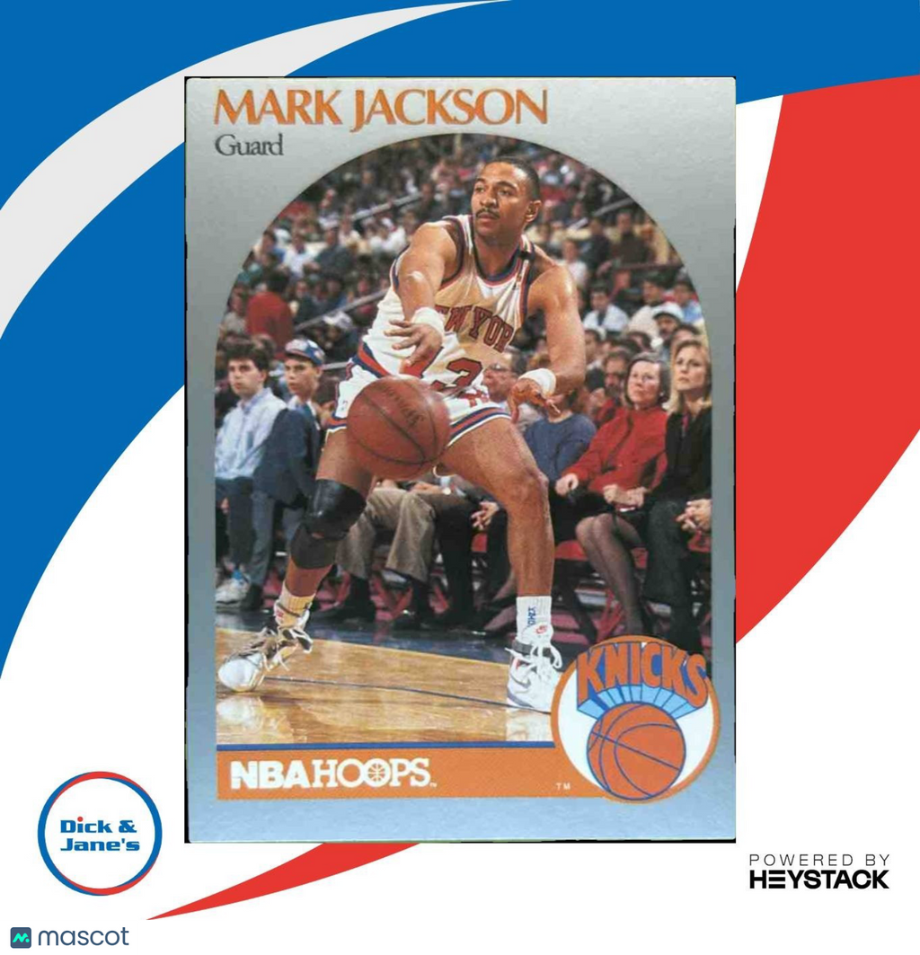 1990-91 Hoops Mark Jackson #205 New York Knicks trading card featuring the talented point guard in his iconic Knicks uniform. A must-have for any NBA collector looking to add a piece of basketball history to their collection. Don't miss out on this classic card capturing a moment in Knicks' history. Listed With Mascot.