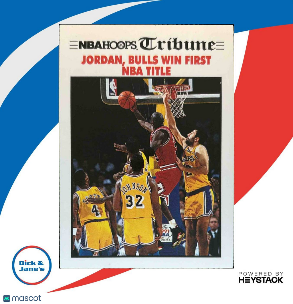 Rare and highly sought after 1991-92 Hoops Michael Jordan trading card featuring the Chicago Bulls winning their first NBA title against the Los Angeles Lakers. A must-have for collectors and Bulls fans, this card captures a historic moment in NBA history. Don't miss out on adding this gem to your collection! Listed With Mascot.