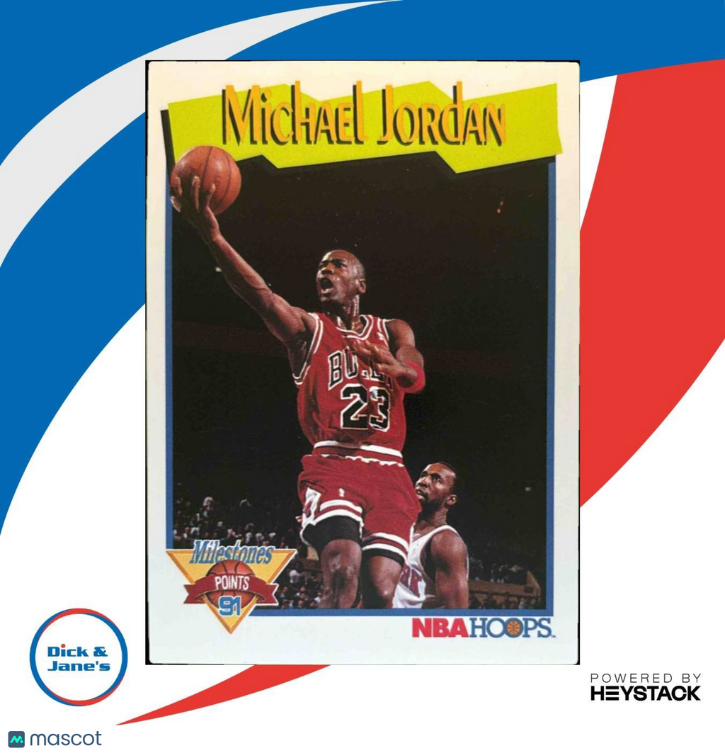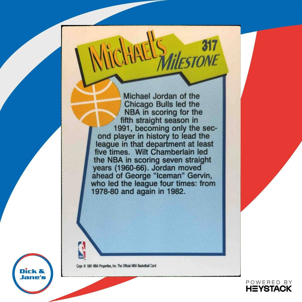 This iconic 1991-92 Hoops Michael Jordan #317 Chicago Bulls NBA trading card features the legendary MJ in action. A must-have for any basketball card collector, this sought-after card showcases Jordan at the height of his career. Don't miss your chance to own a piece of basketball history! Listed With Mascot.