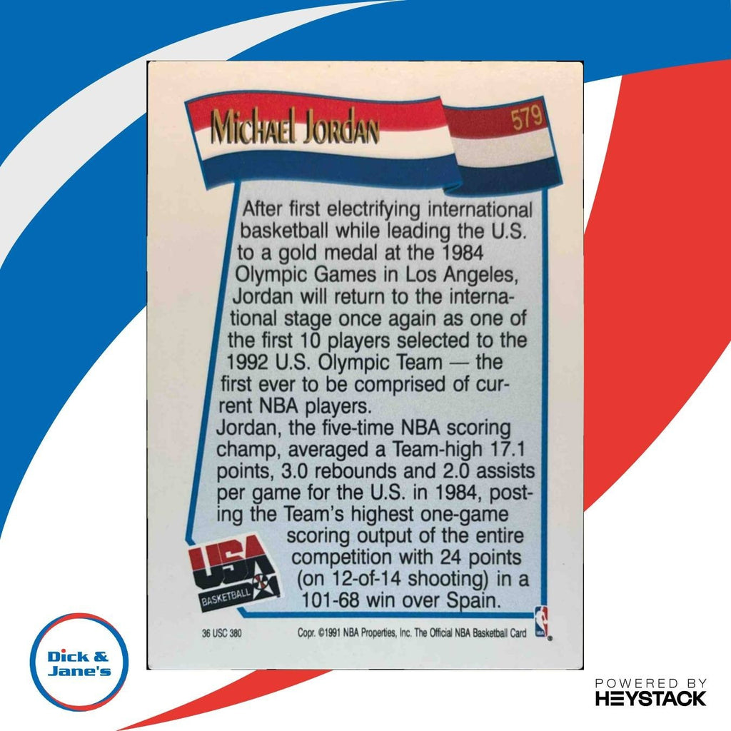 The 1991-92 Hoops Michael Jordan #579 USA trading card is a must-have collectible for any NBA fan. Featuring the legendary MJ in his iconic USA Basketball uniform, this card is the perfect addition to any sports card collection. Don't miss your chance to own a piece of basketball history! Listed With Mascot.