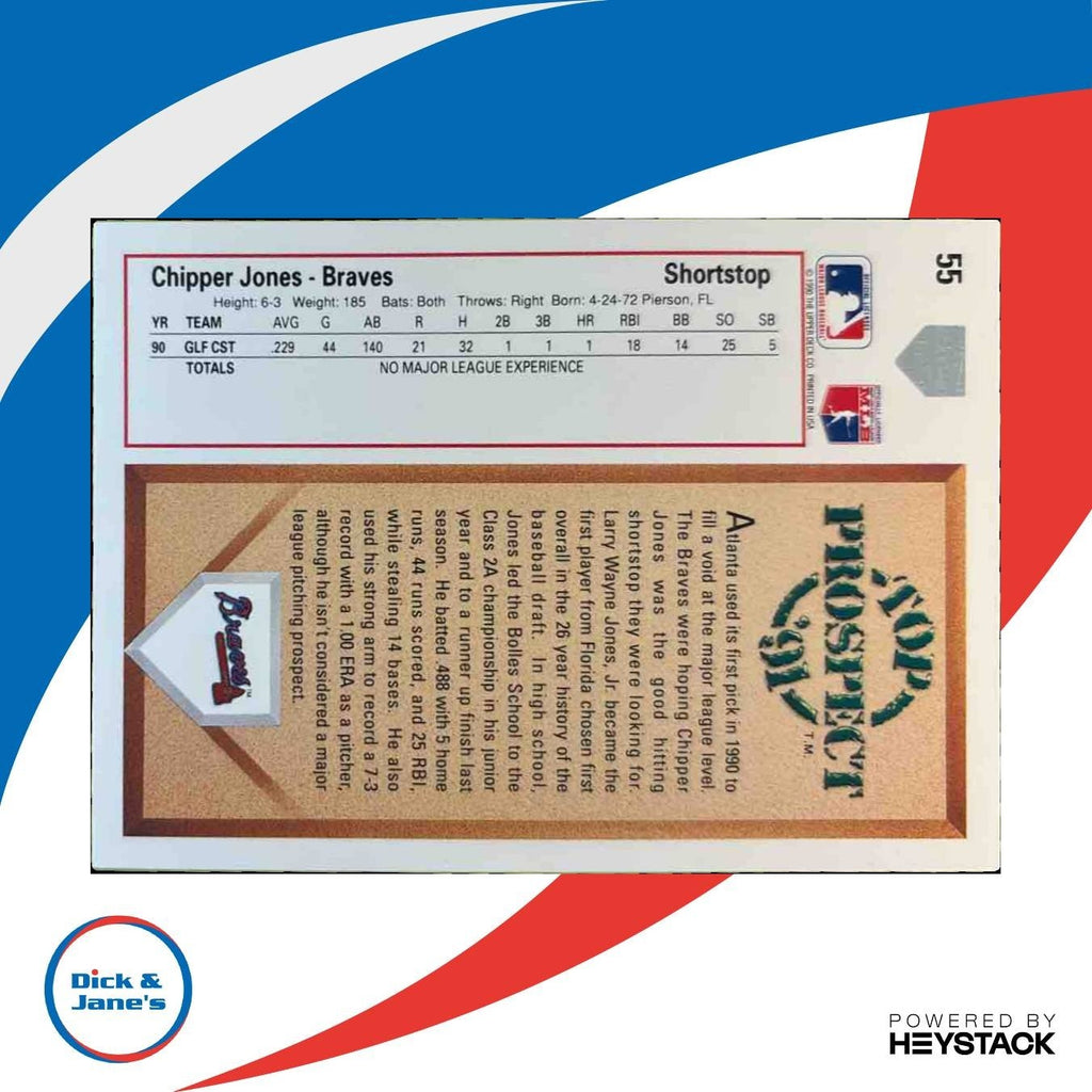 1991 Upper Deck Chipper Jones #55 RC Atlanta Braves trading card. Capture a piece of baseball history with this rookie card featuring the legendary Atlanta Braves player. A must-have for any collector or fan of MLB memorabilia. Add this iconic card to your collection today! Listed With Mascot.