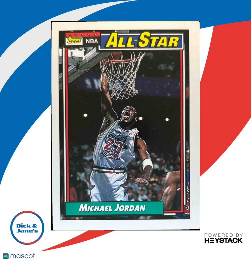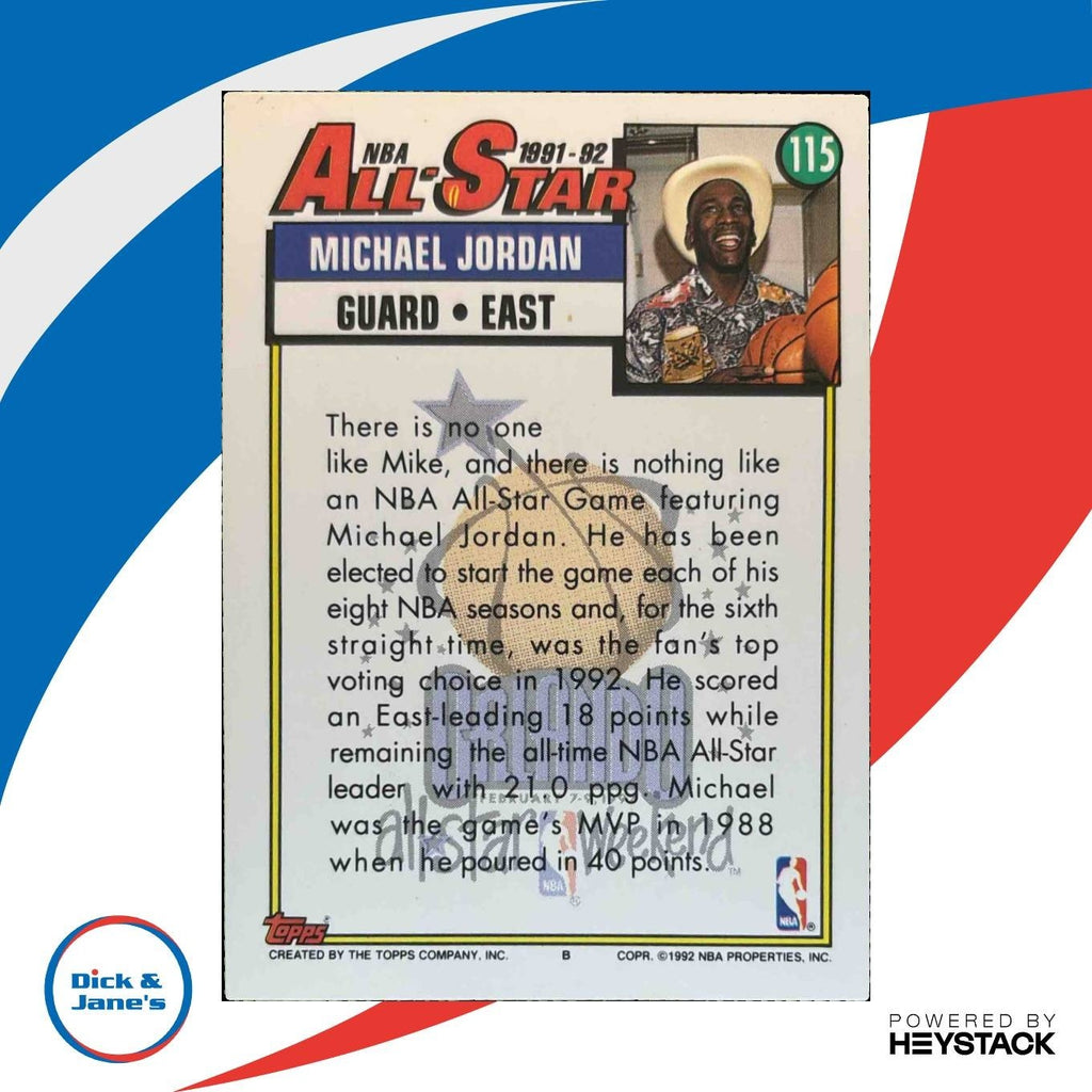This rare 1992-93 Topps Michael Jordan #115 Chicago Bulls trading card is a must-have for any NBA fan or collector. Featuring the iconic basketball legend in his prime, this card is highly sought after and makes for a valuable addition to any sports memorabilia collection. Don't miss your chance to own a piece of basketball history with this iconic Michael Jordan trading card. Listed With Mascot.