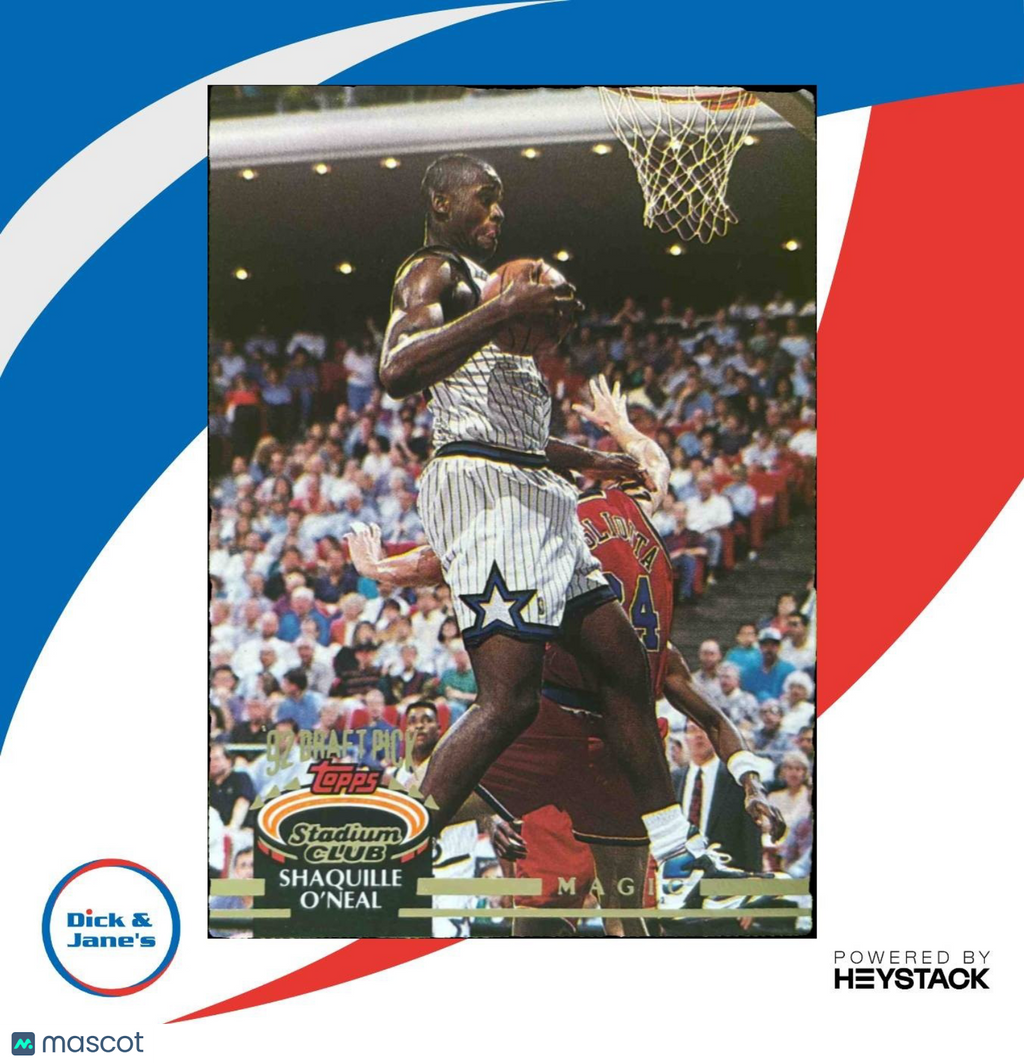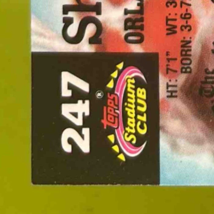 For sale: 1992-93 Topps 93 Stadium Club Shaquille O'Neal #247 RC Orlando Magic NBA trading card. Rare rookie card featuring the legendary star in his early years with the Magic. A must-have for any basketball card collector. Don't miss out on this iconic piece of sports memorabilia! Listed With Mascot.