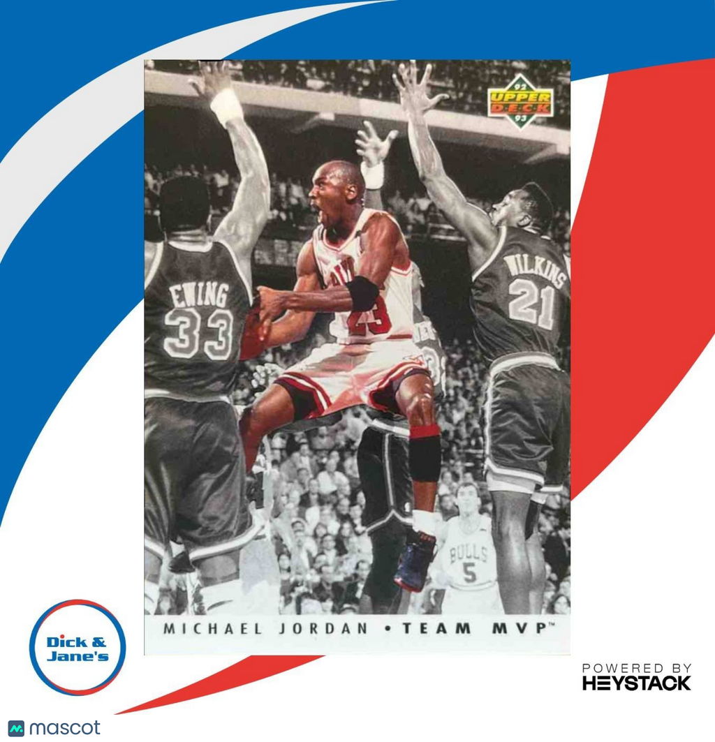Rare 1992-93 Upper Deck Michael Jordan Team MVPs #TM5 Chicago Bulls card featuring the legendary NBA player. A must-have for any basketball card collector, this card showcases Jordan during his prime. Own a piece of basketball history with this iconic trading card. Listed With Mascot.