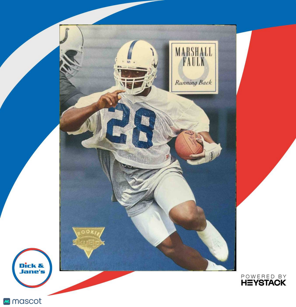1994 Skybox Premium Marshall Faulk #158 RC Indianapolis Colts NFL trading card. This Rookie Card captures Faulk's early days on the Colts. Perfect for collectors and fans alike. A must-have for any football memorabilia enthusiast. Don't miss your chance to own a piece of NFL history! Listed With Mascot.