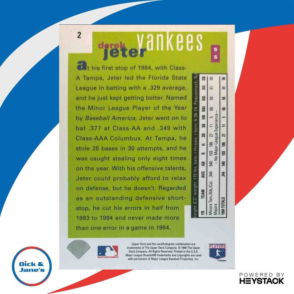 This 1995 Upper Deck Collector's Choice SE Derek Jeter Silver Signature #2 RC card is a highly sought-after MLB collectible featuring the rookie card of the legendary New York Yankees shortstop. A must-have for any baseball card collector or Derek Jeter fan, this card is in excellent condition and is a great addition to any sports memorabilia collection. Don't miss your chance to own a piece of baseball history! Listed With Mascot.