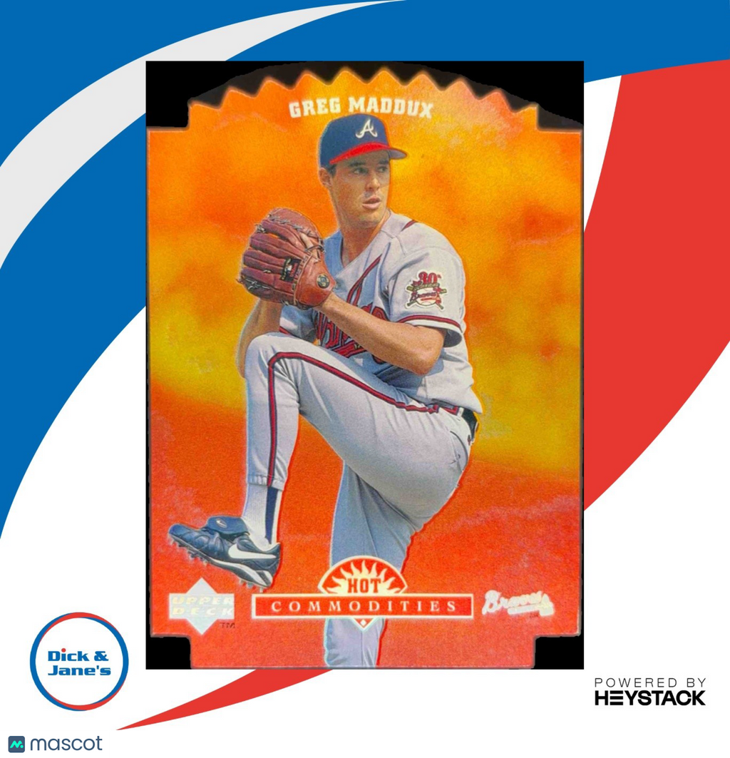 This rare 1996 Upper Deck Greg Maddux Hot Commodities #HC10 trading card features the legendary Atlanta Braves pitcher in action. A must-have for any baseball card collector, this card showcases Maddux's incredible talent and is a valuable addition to any collection. Don't miss out on the chance to own a piece of baseball history! Listed With Mascot.