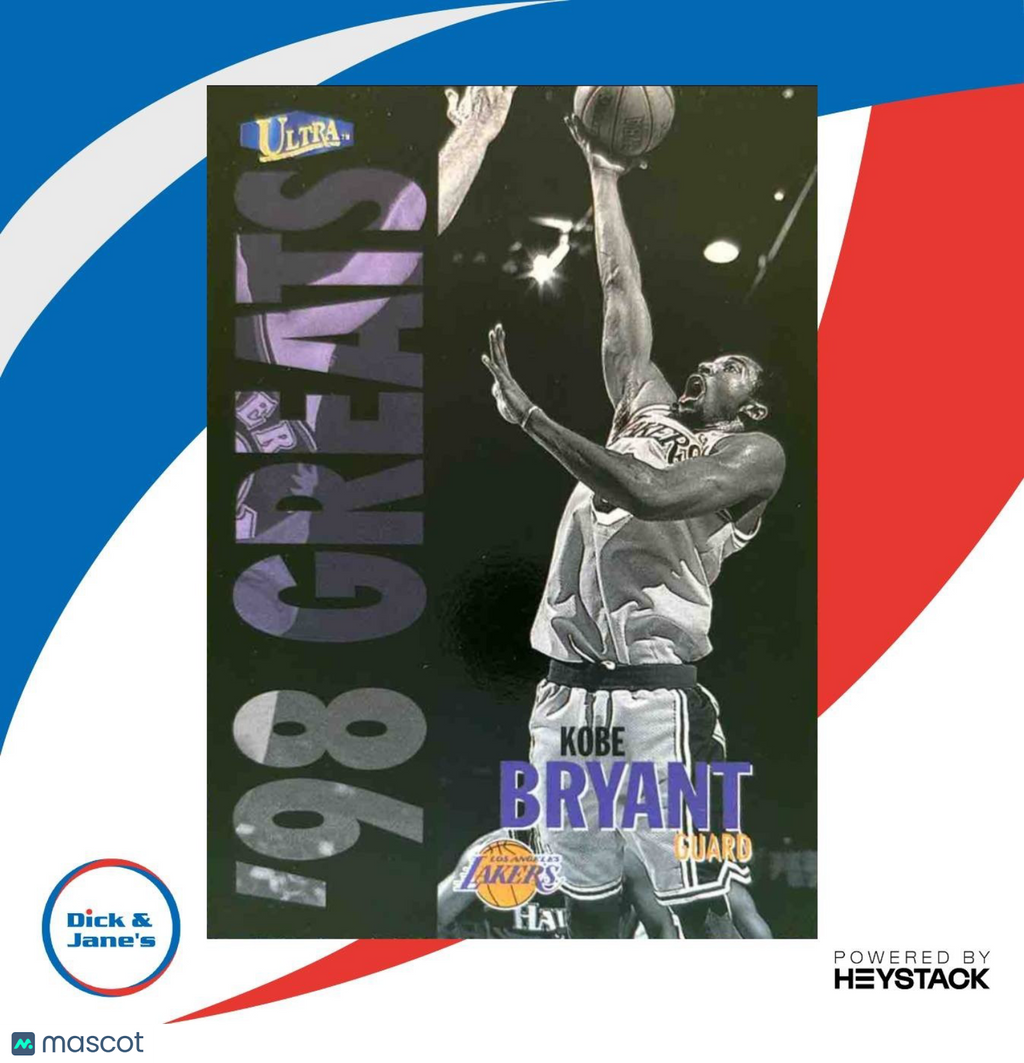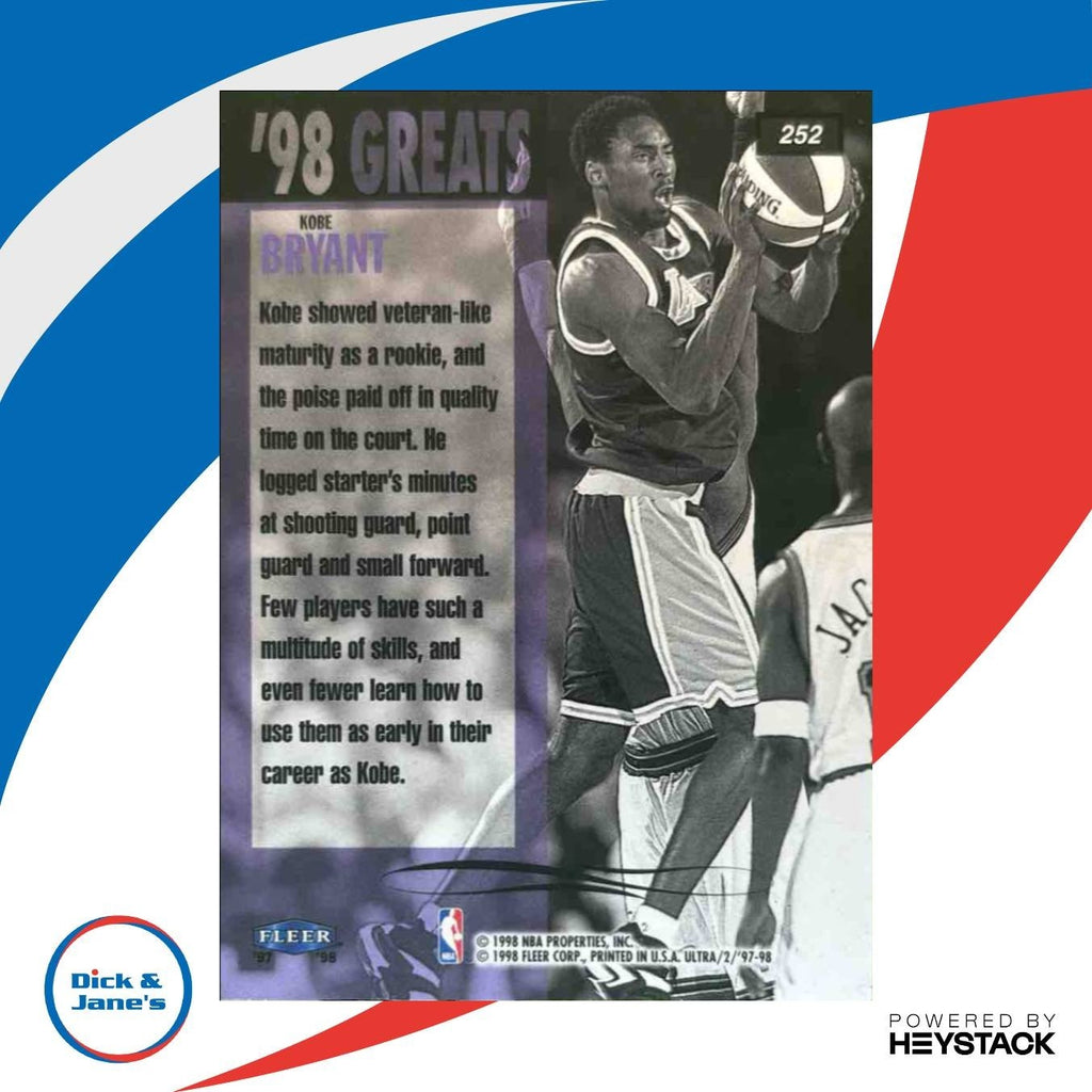 Iconic 1997-98 Fleer Ultra Kobe Bryant #252 Los Angeles Lakers trading card. Features a young Kobe Bryant in his Lakers uniform, capturing his early days in the NBA. A must-have for any basketball card collector or Kobe fan. Limited edition, rare find. Don't miss out on adding this piece of basketball history to your collection. Listed With Mascot.