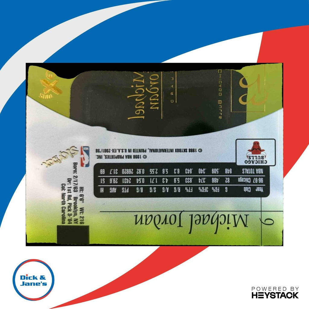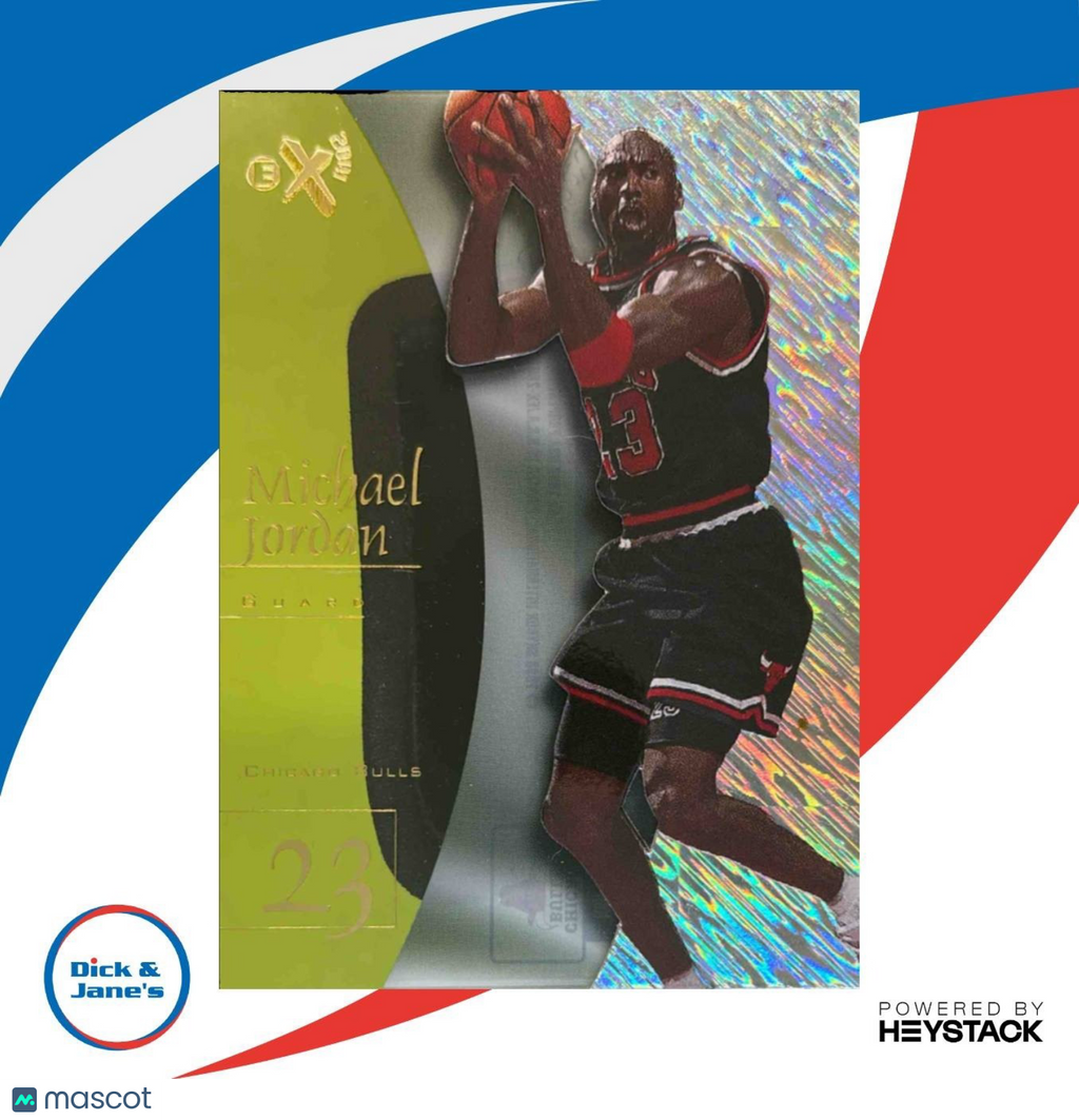 This iconic 1997-98 Skybox E-X2001 Michael Jordan #9 Chicago Bulls NBA trading card is a must-have for any basketball card collector. Featuring the legendary Chicago Bulls player in action, this card is a highly sought-after piece of sports memorabilia. Don't miss your chance to own a piece of basketball history with this rare and valuable card. Listed With Mascot.