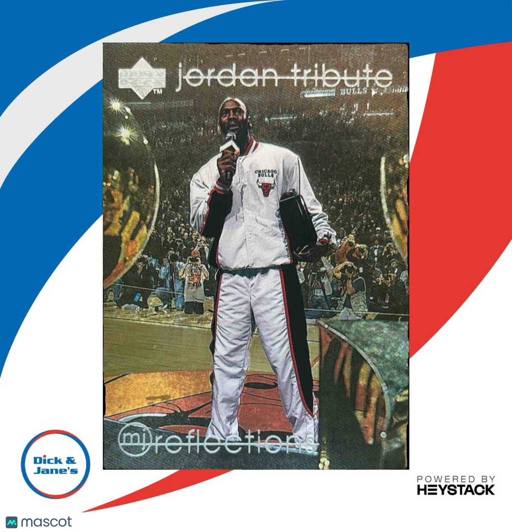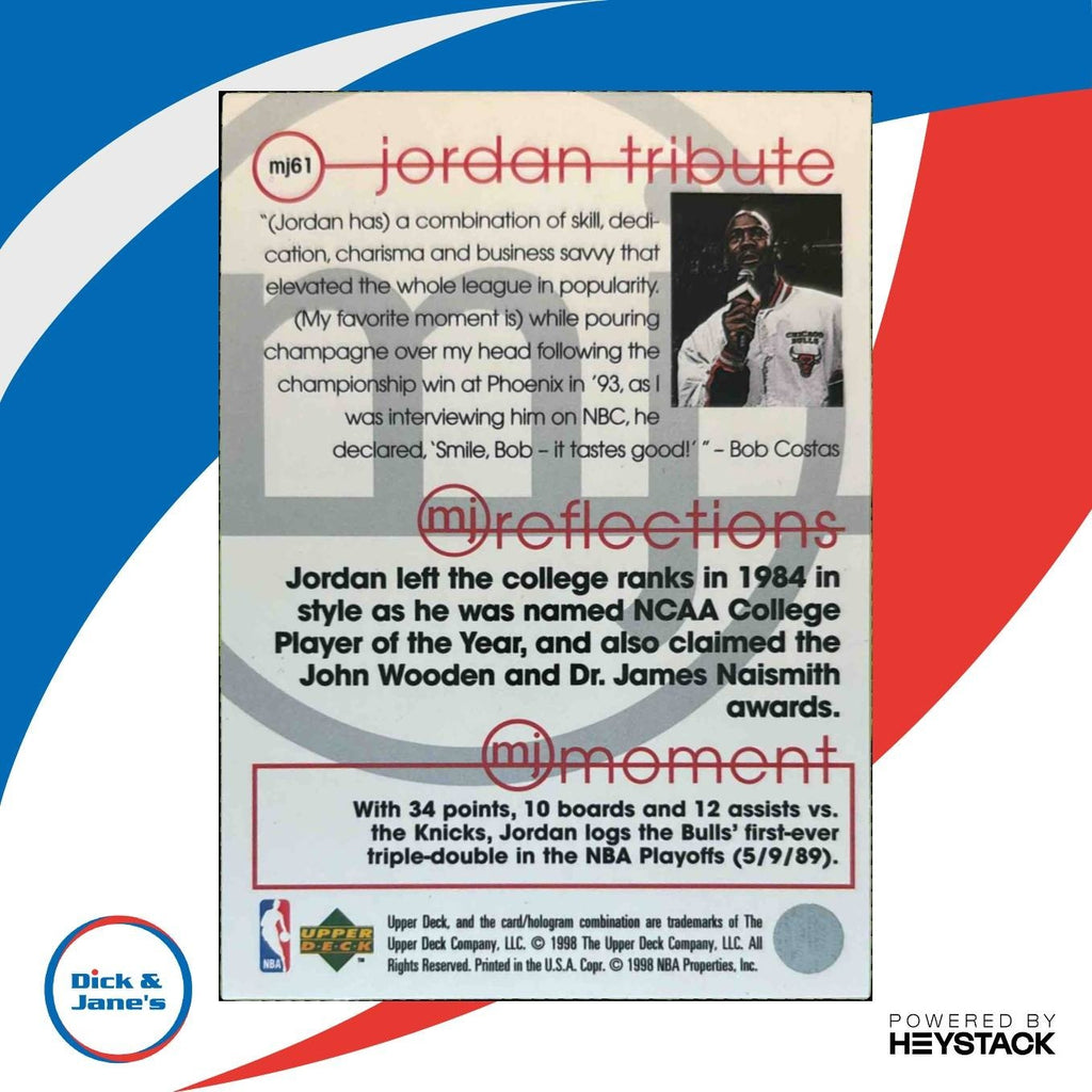 : Own a piece of basketball history with this rare 1997-98 Upper Deck Michael Jordan Tribute card, featuring #MJ61 from his time with the Chicago Bulls. This highly collectible NBA card showcases Jordan's iconic skills and is a must-have for any sports memorabilia enthusiast. Don't miss out on adding this legendary piece to your collection! Listed With Mascot.