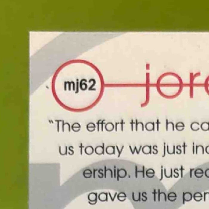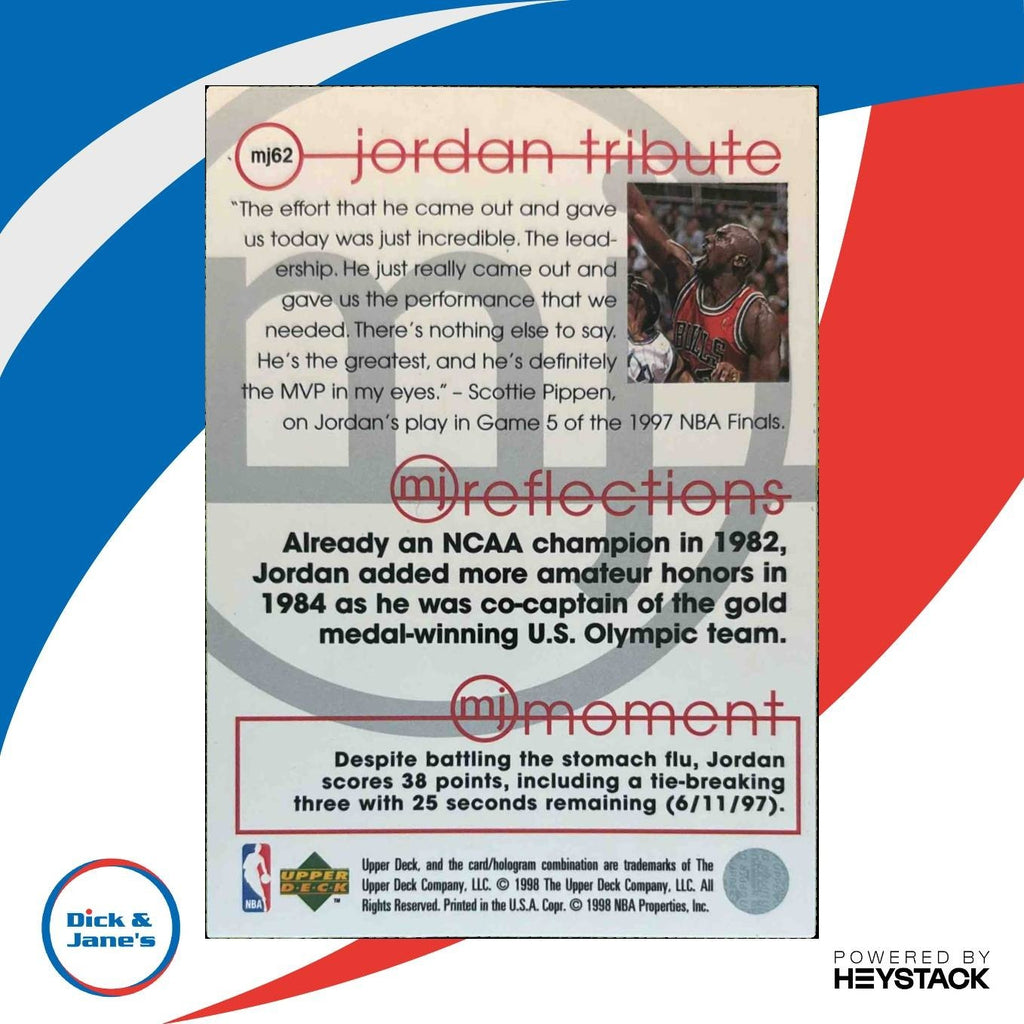 This 1997-98 Upper Deck Michael Jordan Tribute #MJ62 Chicago Bulls card is a must-have for any NBA collector. Featuring the legendary MJ in his iconic Bulls uniform, this card showcases Jordan at the peak of his career. Don't miss out on adding this rare and highly sought-after sports trading card to your collection today! Listed With Mascot.