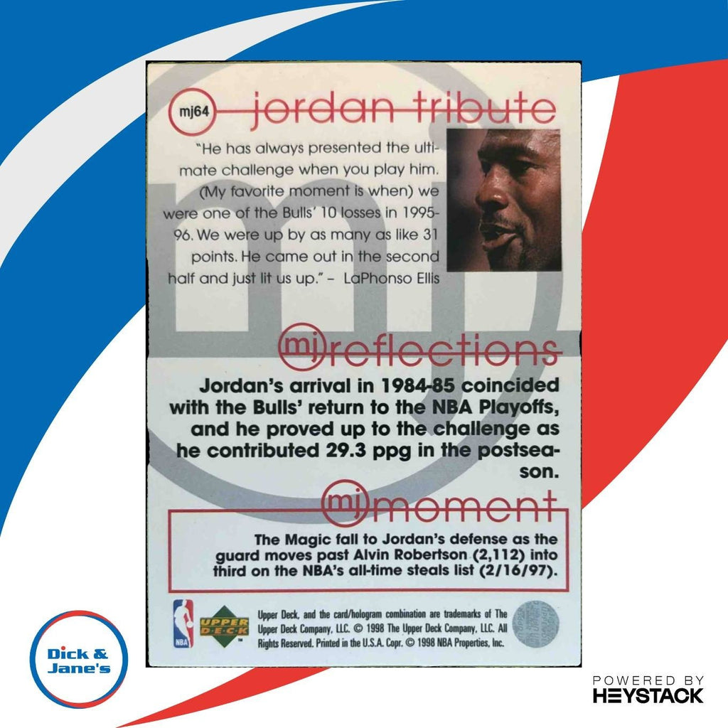 This rare 1997-98 Upper Deck Michael Jordan Tribute #MJ64 card features the iconic Chicago Bulls player in action. Perfect for collectors and fans alike, this NBA card is a must-have for any Jordan enthusiast. Don't miss your chance to own a piece of basketball history! Listed With Mascot.