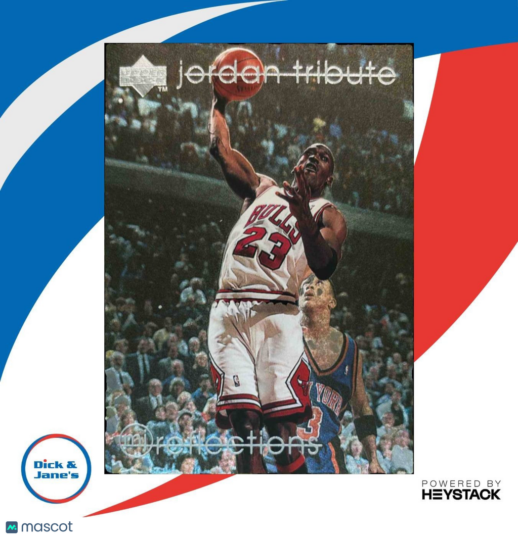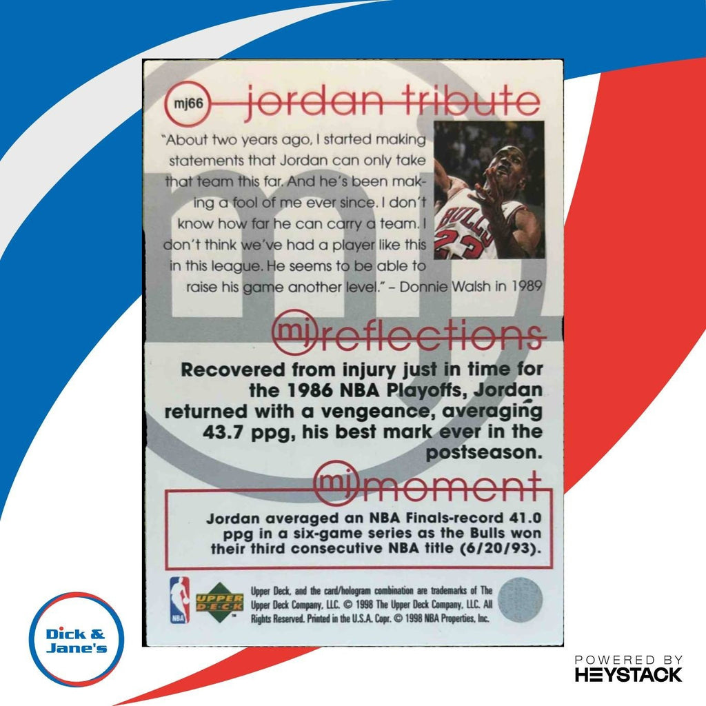Celebrate the legacy of basketball legend Michael Jordan with this 1997-98 Upper Deck Tribute card #MJ66 featuring the Chicago Bulls. A must-have for any collector, this rare NBA card showcases Jordan in his prime and is sure to become a prized possession in your sports memorabilia collection. Own a piece of basketball history today! Listed With Mascot.