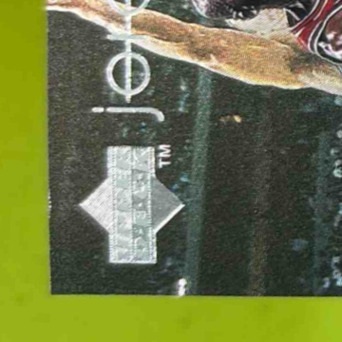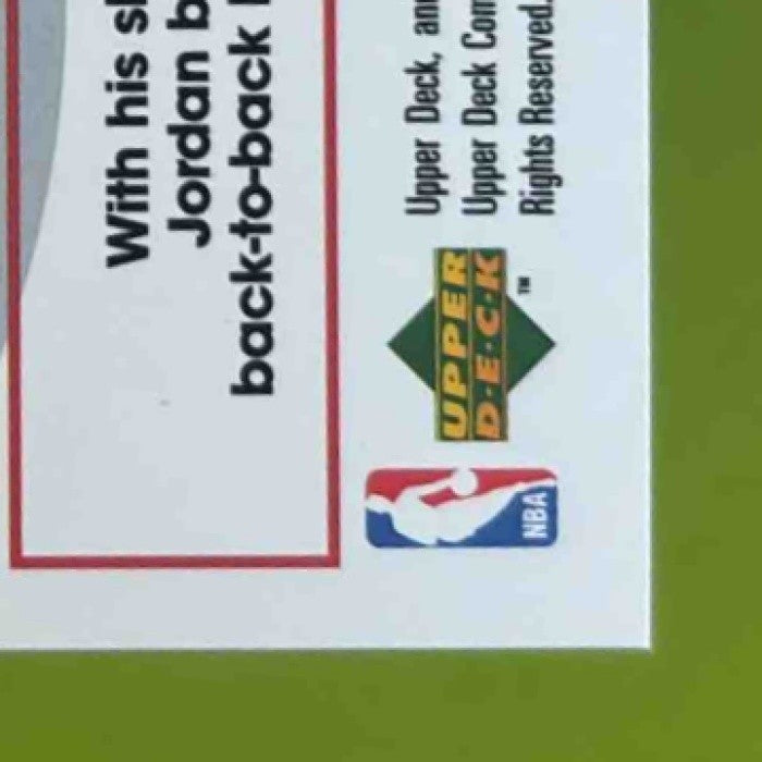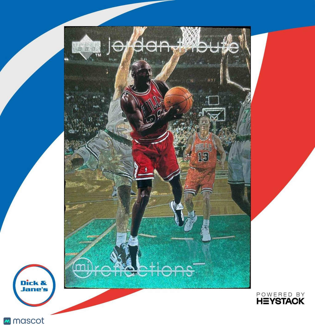 The 1997-98 Upper Deck Michael Jordan Tribute #MJ68 Chicago Bulls trading card features the legendary NBA player in his iconic red and black Bulls jersey. This must-have card commemorates Jordan's unforgettable career and showcases his unparalleled skills on the court. A true collector's item for any basketball fan. Listed With Mascot.