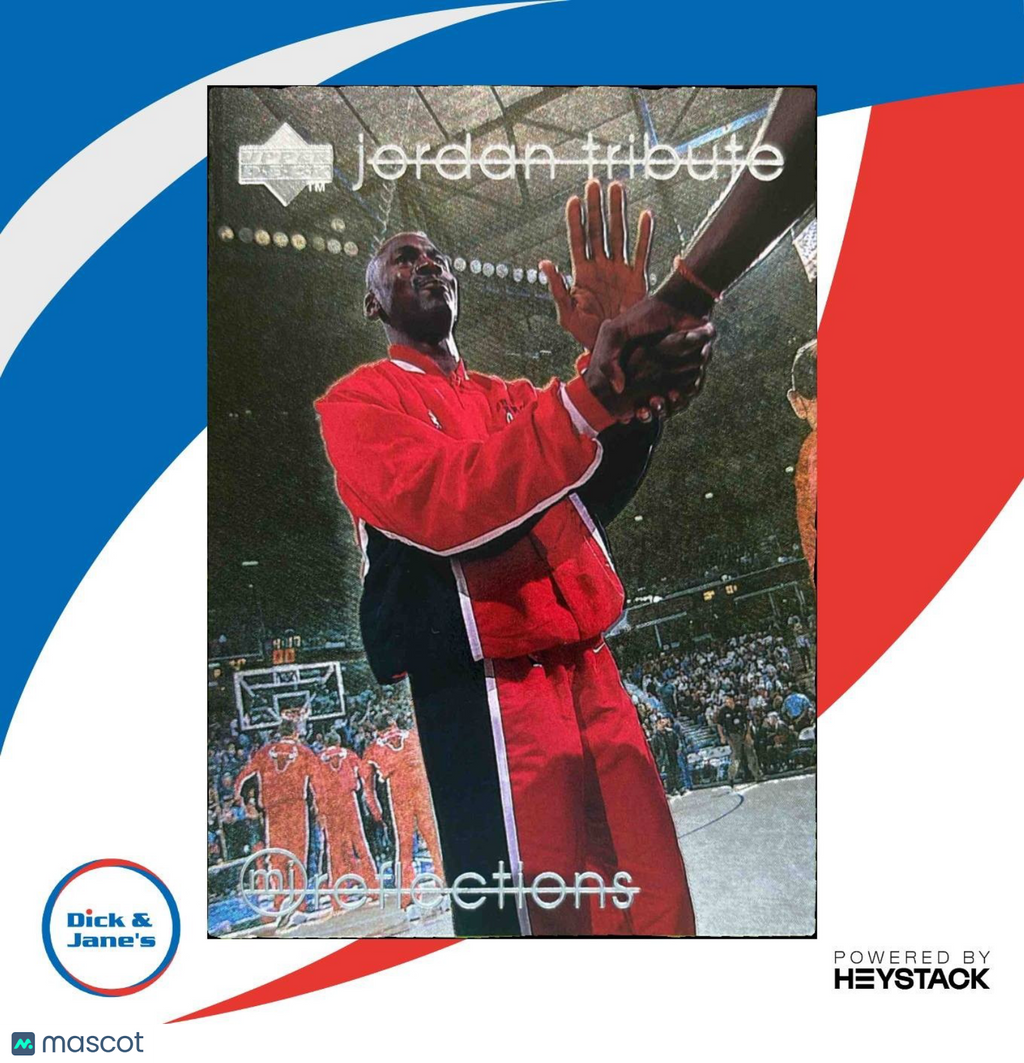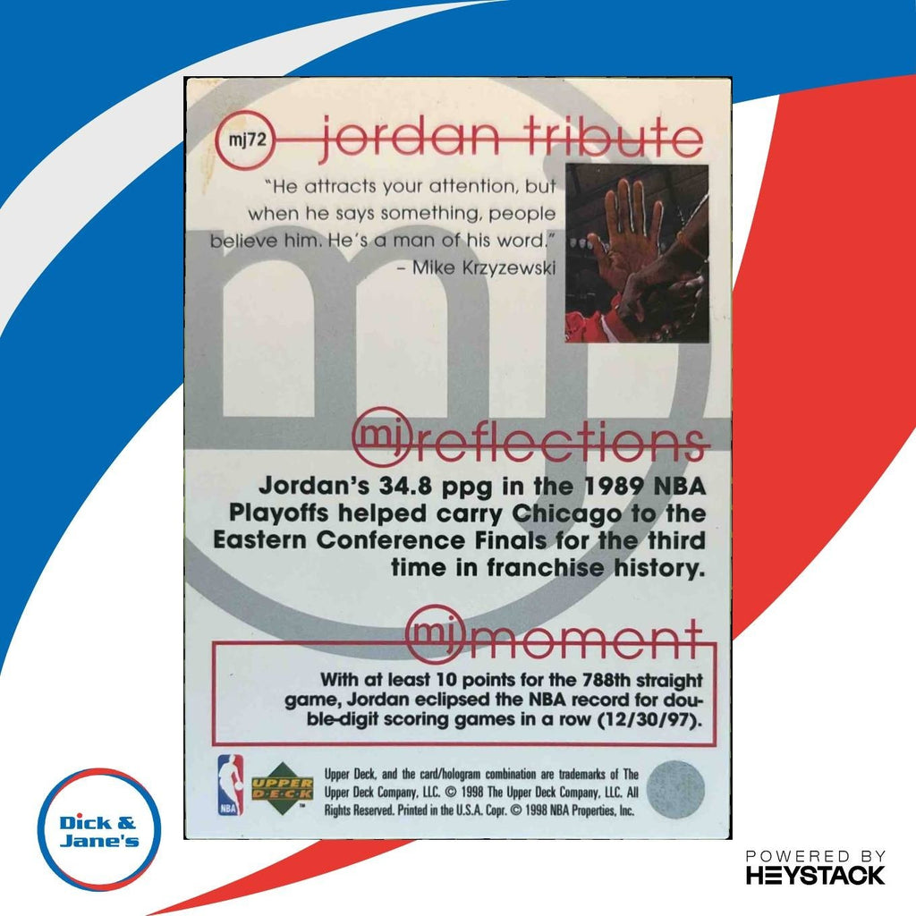 : Rare 1997-98 Upper Deck Michael Jordan Tribute #MJ72 Chicago Bulls NBA trading card. A must-have for any basketball card collector or Michael Jordan fan. Commemorating the legendary career of the greatest basketball player of all time. A valuable piece of sports memorabilia. Grab it now before it's gone! Listed With Mascot.
