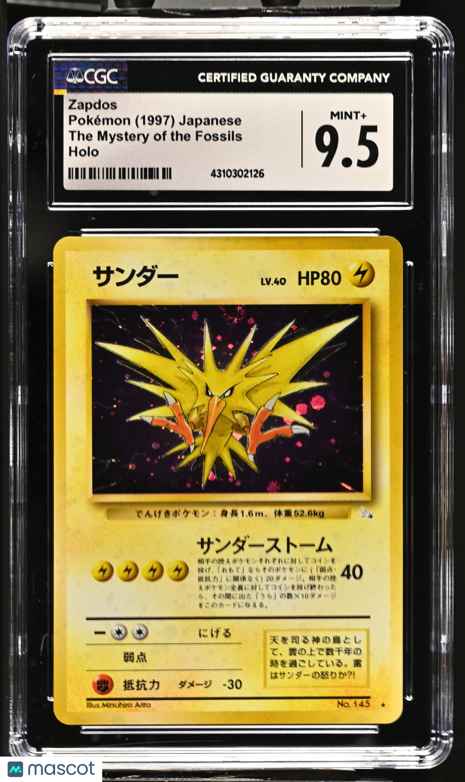 You are purchasing a 1997 Pokémon The Mystery of the Fossils Zapdos Japanese CGC 9.5. You will receive the exact item in the photographs. Thank you for looking. Listed With Mascot.