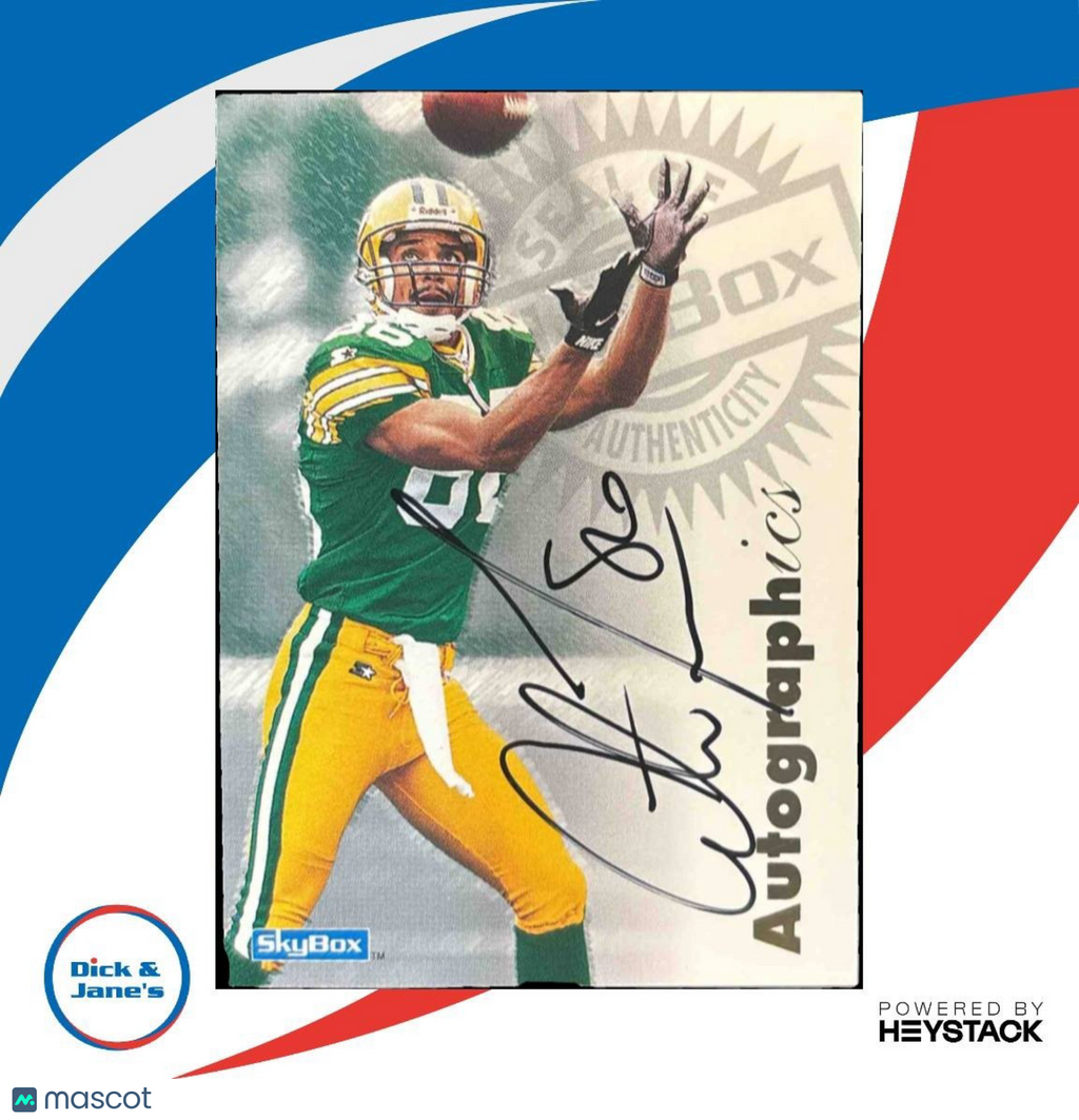 1997 Skybox Premium Antonio Freeman Autographics #NNO Auto Green Bay Packers trading card. Features an authentic autograph of NFL star Antonio Freeman. Collectible item for football fans and collectors. Don't miss out on this rare piece of memorabilia! Listed With Mascot.
