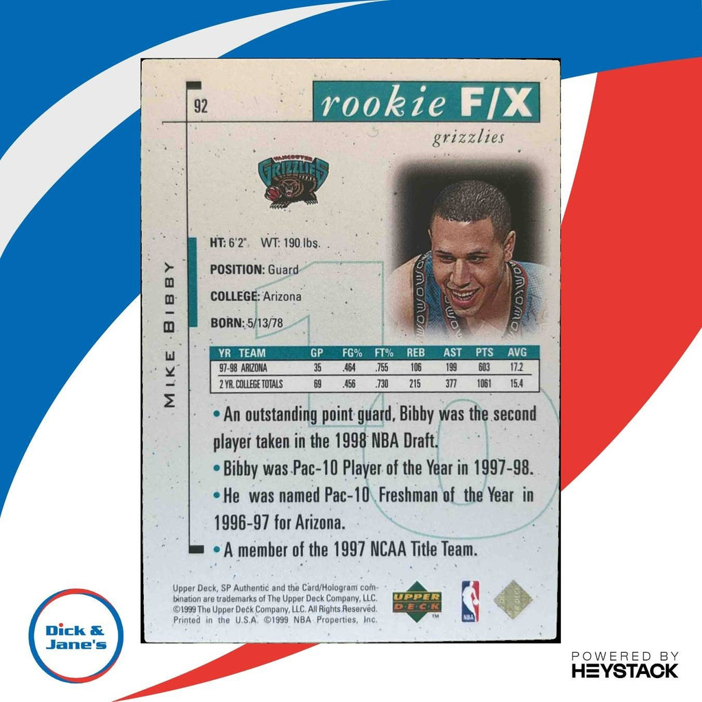 A rare find for any basketball card collector! This 1998-99 SP Authentic Mike Bibby rookie card features the Vancouver Grizzlies point guard at the beginning of his career. Limited to only 3500 copies, this is a must-have for any Bibby fan or trading card enthusiast. Don't miss out on the opportunity to own a piece of NBA history! Listed With Mascot.