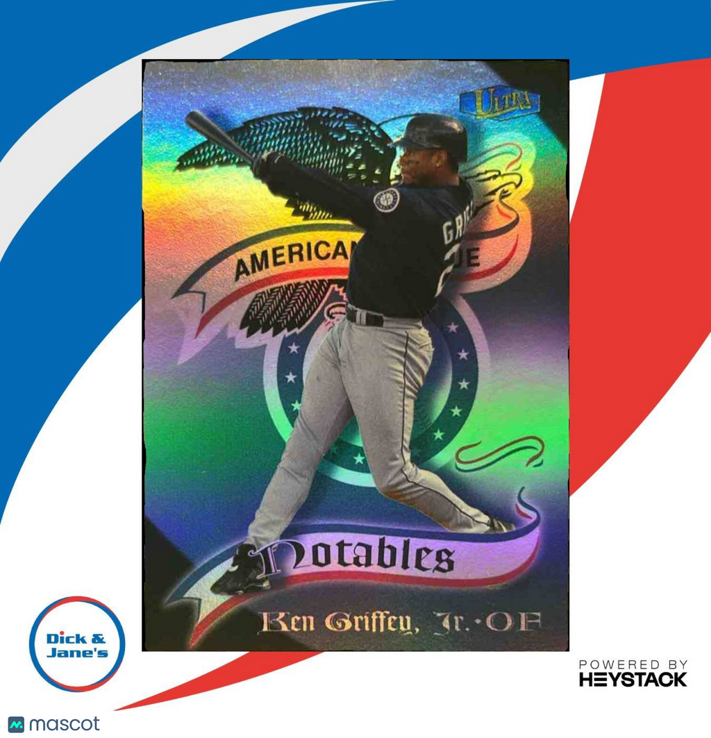 The 1998 Fleer Ultra Ken Griffey Jr. Notables #2N sports trading card features the legendary MLB player from the Seattle Mariners. This rare and highly sought-after card showcases Griffey's iconic swing and signature smile. A must-have for any baseball card collector or Ken Griffey Jr. fan! Listed With Mascot.