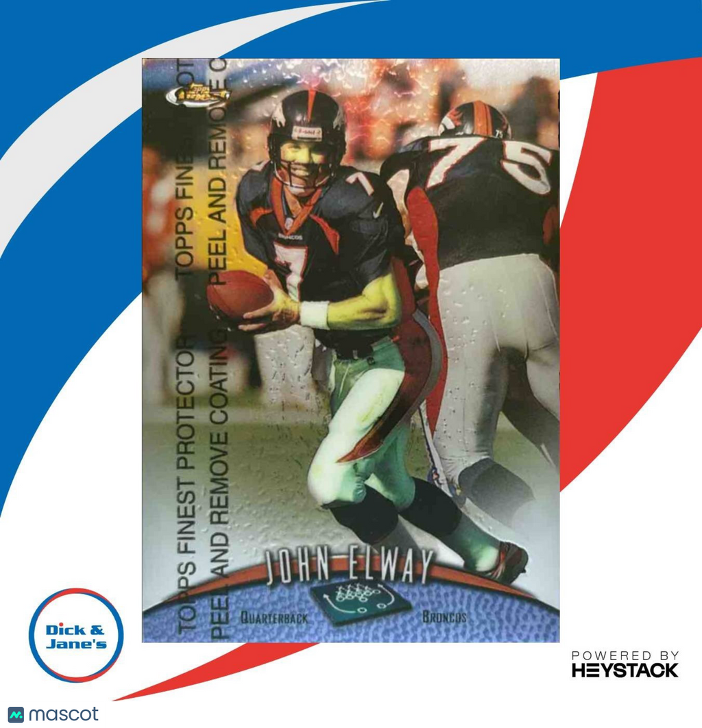 Add a piece of history to your collection with the 1998 Topps Finest John Elway #1 Denver Broncos trading card. This iconic NFL card features the legendary quarterback in immaculate condition. A must-have for any football fan or collector. Get yours today! Listed With Mascot.