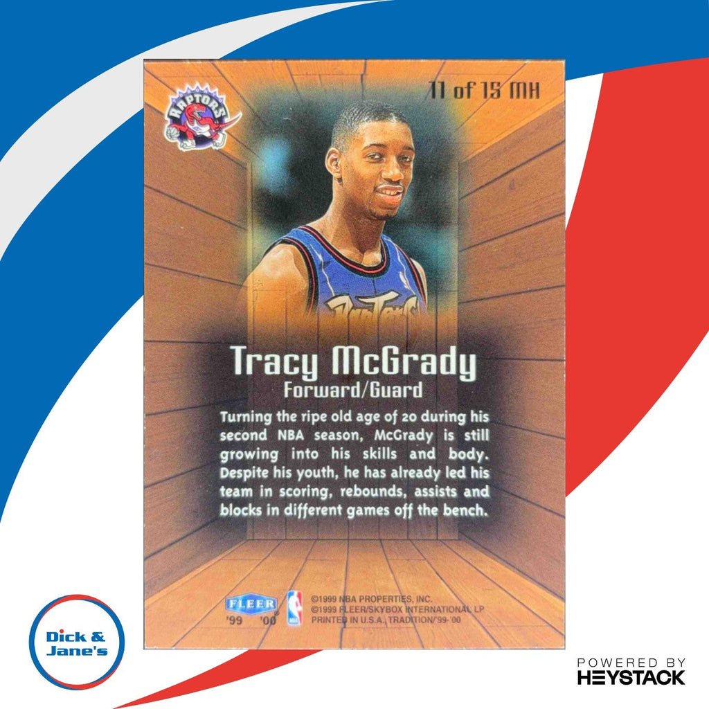 1999-00 Fleer Tradition Tracy McGrady Masters of the Hardwood #11 MH Toronto. This rare NBA card showcases a young Tracy McGrady in his prime. With stunning artwork and detailed stats, this card is a must-have for any basketball collector. Don't miss your chance to own a piece of basketball history! Listed With Mascot.