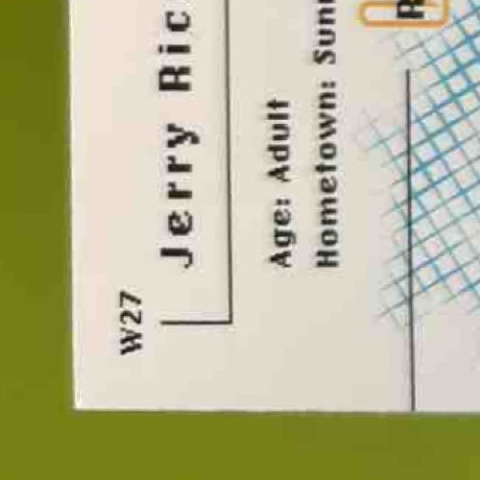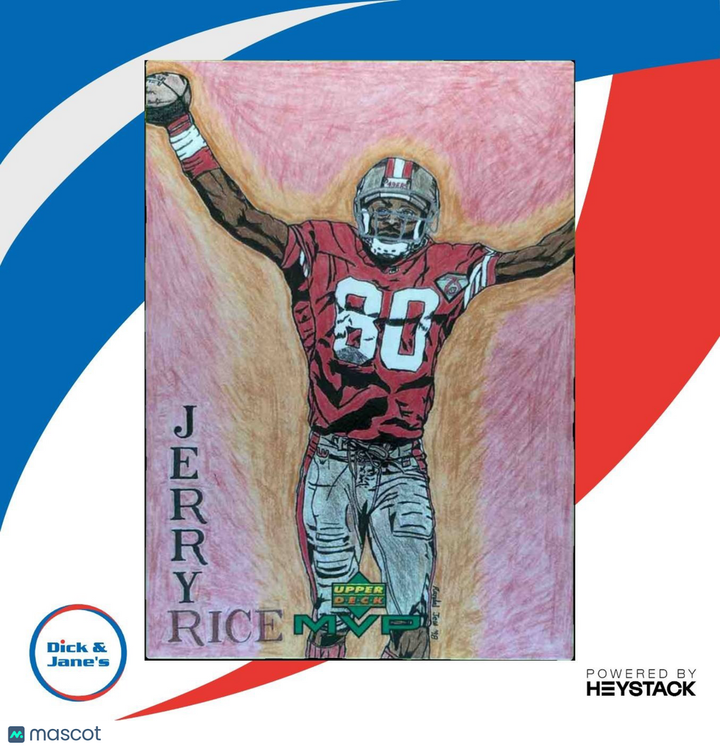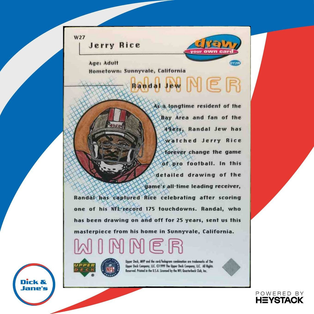Rare 1999 Upper Deck MVP Jerry Rice Draw Your Own Card #W27 featuring the legendary San Francisco 49ers wide receiver. Perfect for any collector or fan of Rice and the 49ers. Limited edition card allows you to customize and personalize - a unique addition to any sports card collection. Grab this piece of football history today! Listed With Mascot.