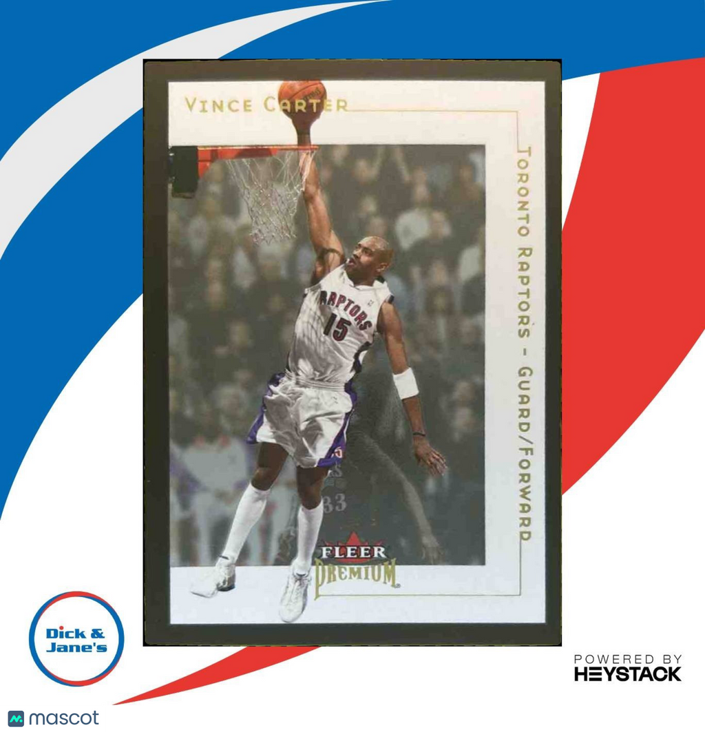 This sports trading card features Vince Carter from the Toronto Raptors during the 2001-02 NBA season. The card is from the Fleer Premium collection and showcases Carter in action on the court. A must-have for any basketball card collector and fan of this iconic player. Listed With Mascot.
