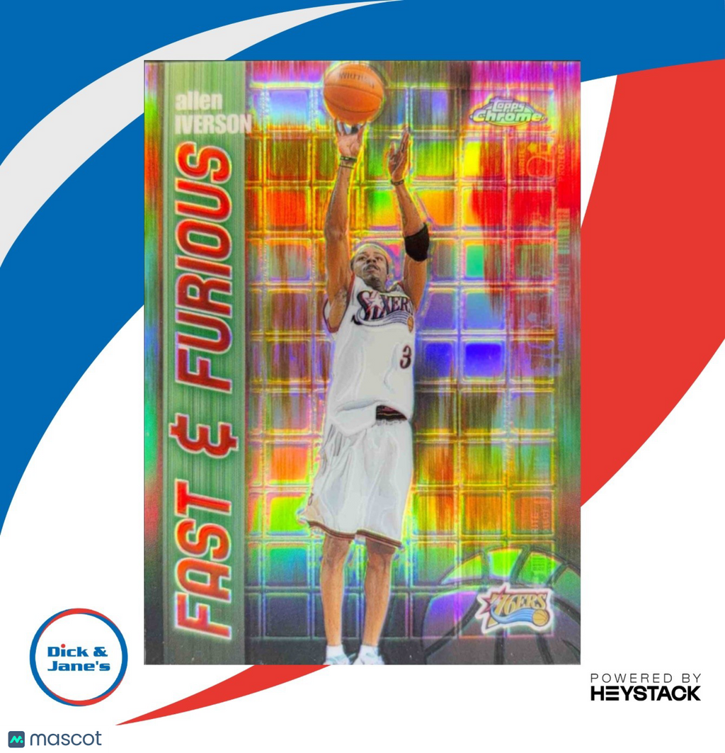 Rare 2001-02 Topps Chrome Allen Iverson Fast and Furious Refractor #FF02 trading card featuring the dynamic Philadelphia NBA star. This highly sought-after card showcases Iverson in action and is a must-have for any basketball card collector. Don't miss your chance to own a piece of NBA history! Listed With Mascot.