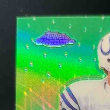 2001 Topps Chrome Peyton Manning Own The Game Refractor #PS2 card featuring Peyton Manning of the Indianapolis Colts. This rare NFL trading card is a must-have for any football collector, with its stunning refractor finish and dynamic action shot of Manning in game-winning form. Don't miss the chance to own a piece of football history with this iconic sports card. Listed With Mascot.