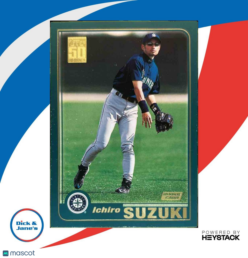 For sale! Rare 2001 Topps Ichiro Suzuki #726 RC Seattle Mariners trading card. A valuable addition to any MLB collection. Featuring rookie card status and iconic player, this card is a must-have for fans and collectors. Don't miss out on this piece of baseball history! Listed With Mascot.