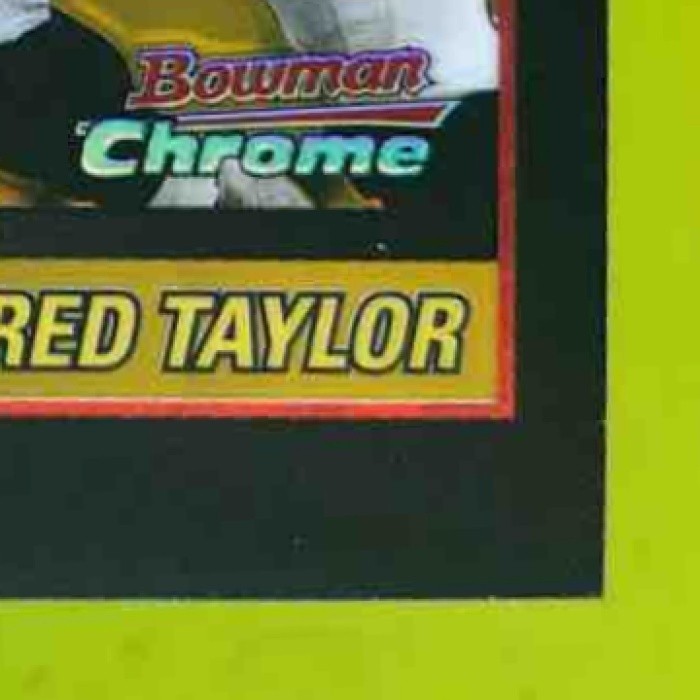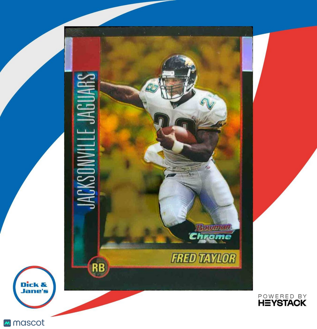 Rare 2002 Bowman Chrome Fred Taylor Refractor Gold card #98 from Jacksonville Jaguars. Limited edition 28/50. A must-have for any NFL collector. Don't miss out on adding this gem to your collection! Listed With Mascot.