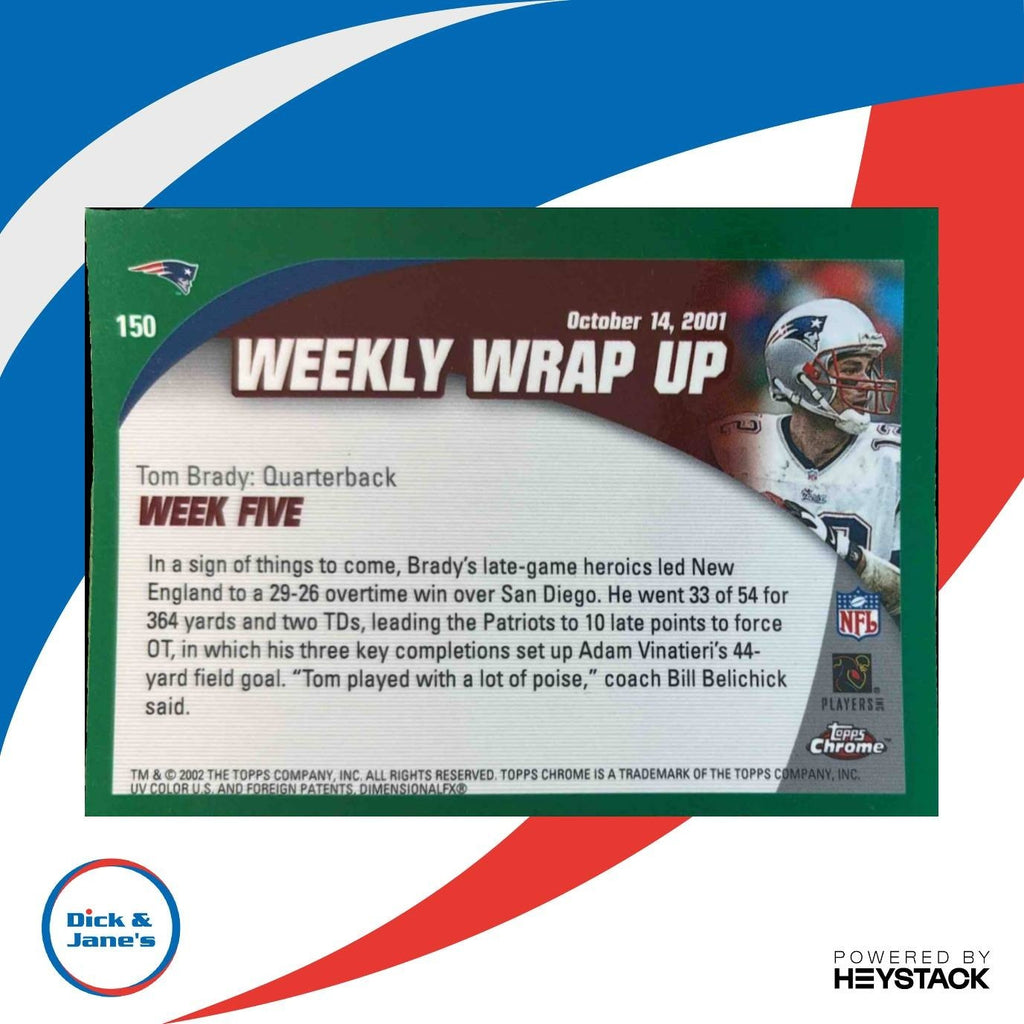 This 2002 Topps Chrome Tom Brady #150 trading card is a must-have for any New England Patriots fan or collector. Featuring the legendary quarterback in his early years, this card is a rare find and a valuable addition to any collection. Don't miss your chance to own a piece of football history! Listed With Mascot.