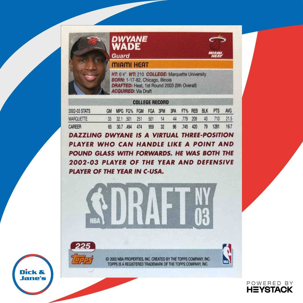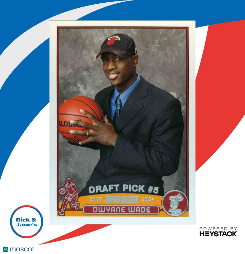 2003-04 Topps Dwyane Wade #225 RC Miami Heat NBA card. This sought-after rookie card features the iconic Miami Heat player in his early years. Perfect addition to any basketball card collection or Dwyane Wade fan memorabilia. Don't miss out on owning this piece of basketball history! Listed With Mascot.