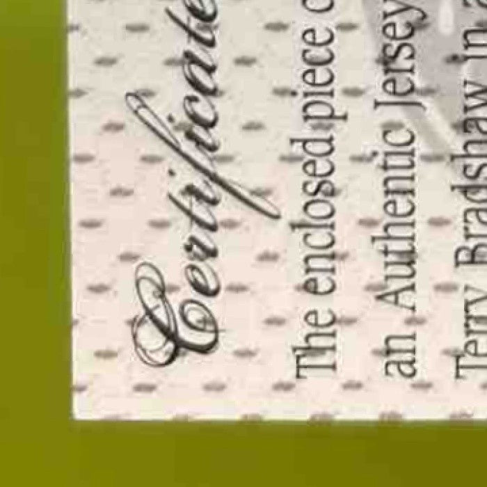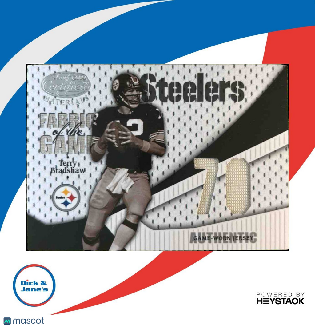Limited edition 2004 Leaf Certified Materials Terry Bradshaw Fabric of the Game trading card, featuring an authentic game-worn jersey swatch from the Pittsburgh Steelers legend. Numbered out of only 70 produced, a must-have for any serious collector or fan of the iconic quarterback. Listed With Mascot.