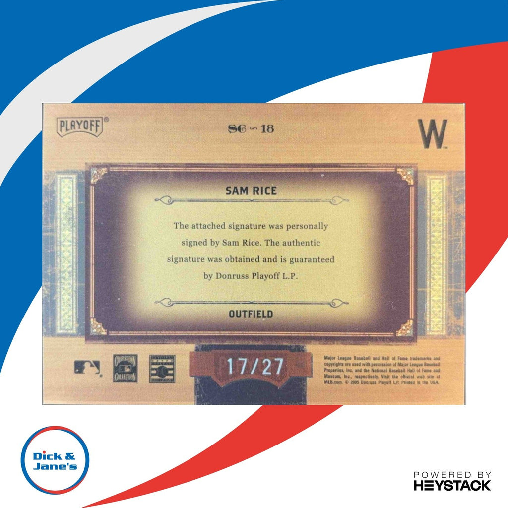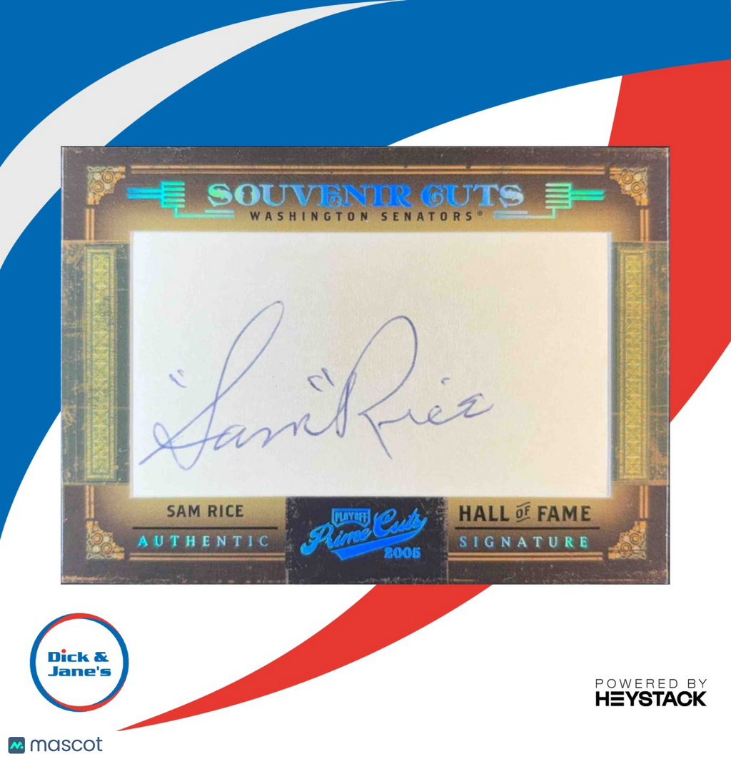 Powered by Frooition Home About Us Contact Other Baseball Baseball Rookies Baseball Inserts Baseball Game Used/Relics Baseball Autographed Football Football Rookies Football Inserts Football Game Used/Relics Football Autographed Basketball Basketball Rookies Basketball Inserts Basketball Game Used/Relics Basketball Autographed Hockey NASCAR Hard Cover Books Music CDs Baseball Boxes Baseball Pack Lots Football Boxes Football Pack Lots Other Boxes Othe Pack Lots Magic Singles 2005 Playoff Prime Cuts Sam Rice Souvenir /27 #SC-18 Auto 2005 Playoff Prime Cuts Sam Rice Souvenir /27 #SC-18 Auto Item Description Own a piece of baseball history with this rare 2005 Playoff Prime Cuts Sam Rice Souvenir sports trading card. Limited to just 27 copies, this card features an authentic autograph from the legendary player himself. Add this valuable collectible to your card collection today! About Us About Us PSA Grading Consignments Buying Cards EBay Live About Us Yes, there was a Dick & Jane! Originally founded in 1989, Dick & Jane's is Jacksonville's oldest hobby and collectibles store. Our focus is on the collector. We started small with comics, coins and cards and evolved based upon our customers needs and desired and now have 14 employees and over 5 million sportscards and nearly 700,000 different items on our dedicated singles sportscard website We have thousands of raw TCG cards in store. Magic the Gathering and Pokemon! We have Jacksonville s largest selection of graded sports and non-sports cards, all accessible on our website! We engage with our customers! Let us know what you would like to see in the store or changes you would suggest that we make. We would like to start hosting MONTHLY TRADE NIGHTS! We always are buying and trading! WE ARE THE LOCAL HOBBY STORE!!! Stop by if you are in the Jacksonville Area! We are right off I-95 near downtown. PSA Grading PSA Grading We