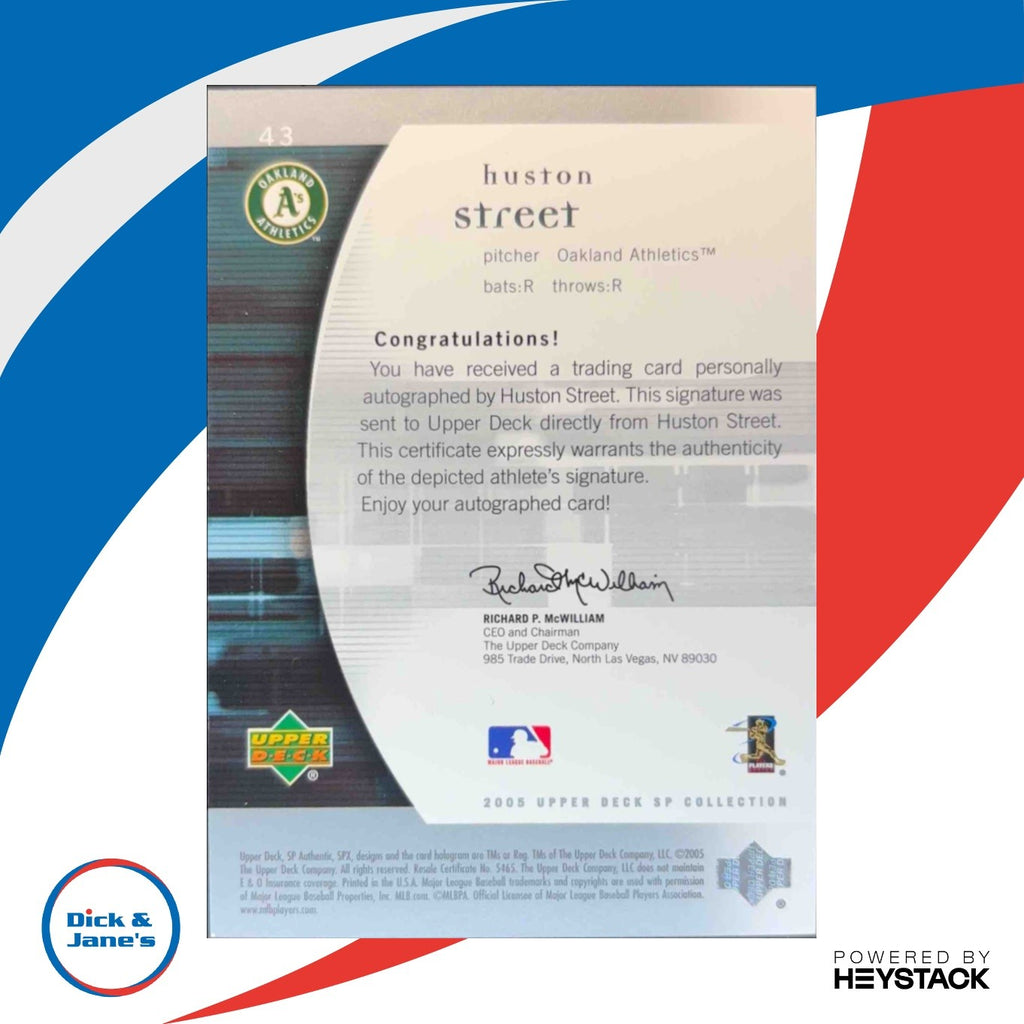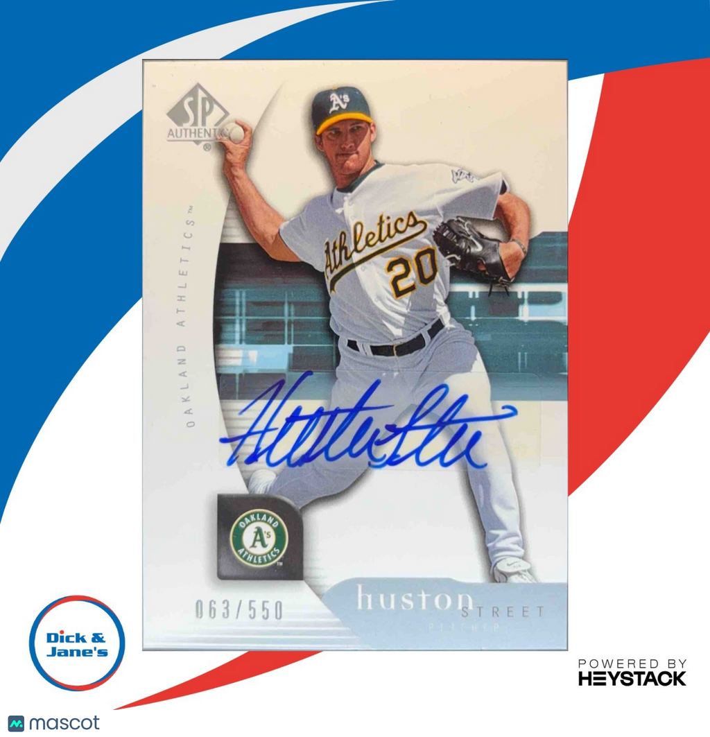 This 2005 SP Authentic Signature sports trading card features Oakland Athletics player Huston Street with a limited edition autograph. Only 550 made. A must-have for any baseball card collector or Oakland A's fan. Add this rare gem to your collection today! Listed With Mascot.