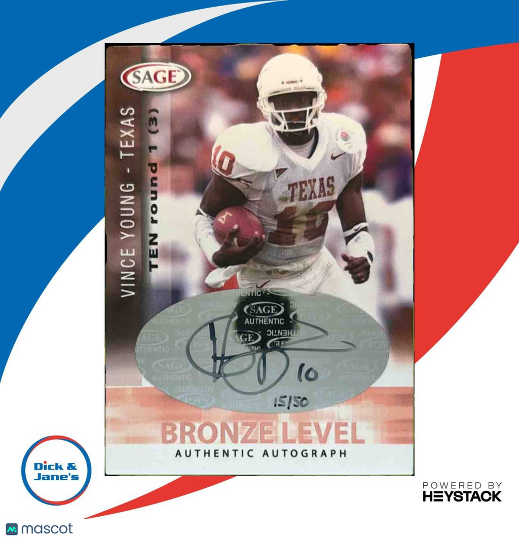 This rare 2006 SAGE Vince Young Auto Bronze trading card features a certified autograph of the Texas Longhorns legend. Limited to only 50 copies, this NCAAF rookie card is a must-have for any collector. Don't miss out on adding this highly sought-after RC Auto to your collection! Listed With Mascot.