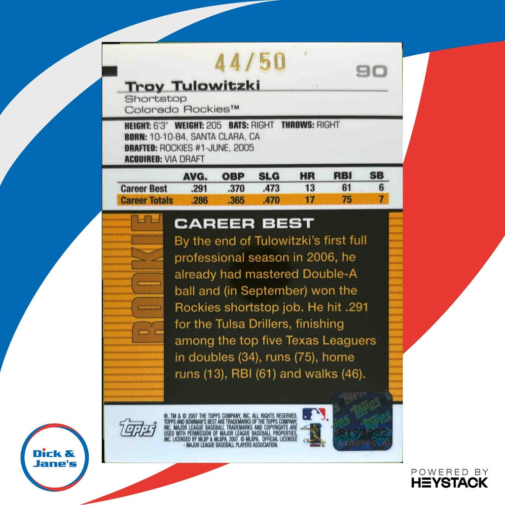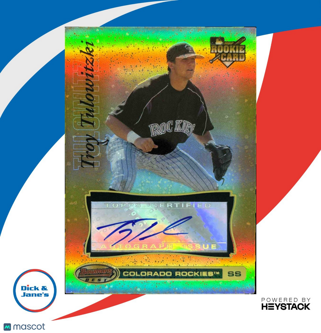 Powered by Frooition Home About Us Contact Other Baseball Baseball Rookies Baseball Inserts Baseball Game Used/Relics Baseball Autographed Football Football Rookies Football Inserts Football Game Used/Relics Football Autographed Basketball Basketball Rookies Basketball Inserts Basketball Game Used/Relics Basketball Autographed Hockey NASCAR Hard Cover Books Music CDs Baseball Boxes Baseball Pack Lots Football Boxes Football Pack Lots Other Boxes Othe Pack Lots Magic Singles 2007 Bowman 's Best Troy Tulowitzki Gold 44/50 #90 Auto RC Colorado Rockies 2007 Bowman 's Best Troy Tulowitzki Gold 44/50 #90 Auto RC Colorado Rockies Item Description Own a piece of MLB history with this rare 2007 Bowman's Best Troy Tulowitzki Gold Autograph Rookie Card. Limited edition, only 50 produced, this card features Tulowitzki's signature and is a must-have for any Colorado Rockies fan or baseball card collector. Add this gem to your collection today! About Us About Us PSA Grading Consignments Buying Cards EBay Live About Us Yes, there was a Dick & Jane! Originally founded in 1989, Dick & Jane's is Jacksonville's oldest hobby and collectibles store. Our focus is on the collector. We started small with comics, coins and cards and evolved based upon our customers needs and desired and now have 14 employees and over 5 million sportscards and nearly 700,000 different items on our dedicated singles sportscard website We have thousands of raw TCG cards in store. Magic the Gathering and Pokemon! We have Jacksonville s largest selection of graded sports and non-sports cards, all accessible on our website! We engage with our customers! Let us know what you would like to see in the store or changes you would suggest that we make. We would like to start hosting MONTHLY TRADE NIGHTS! We always are buying and trading! WE ARE THE LOCAL HOBBY STORE!!! Stop by if you are in the Jacksonville Area! We are right off I-95 near downtown. PSA Grading PSA Grading We