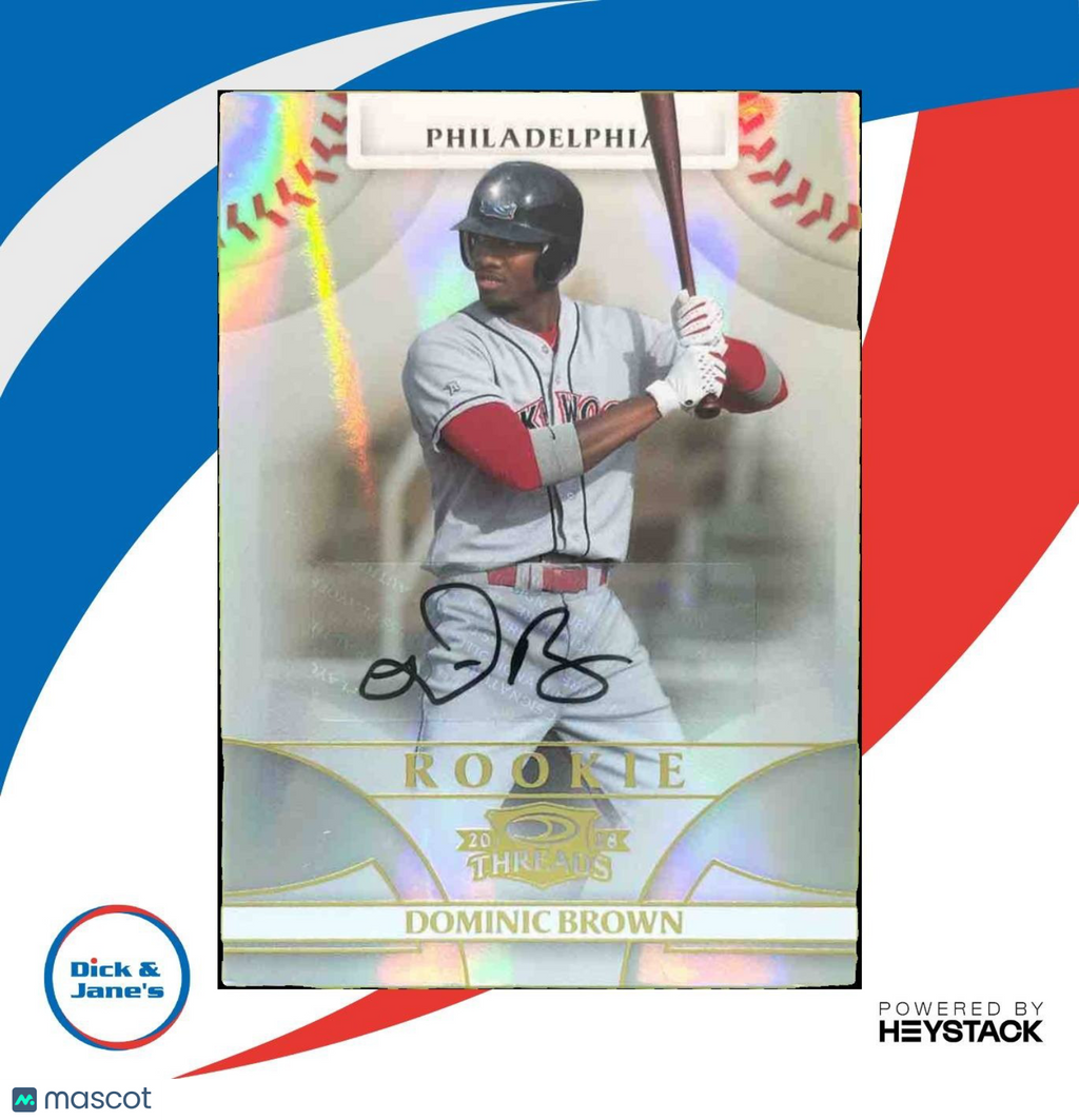 This 2008 Donruss Threads Dominic Brown Signatures trading card is a must-have for any Philadelphia Phillies fan. Limited edition, numbered out of 999, and featuring a hand-signed autograph from the MLB player himself. Add this rare find to your collection today! Listed With Mascot.