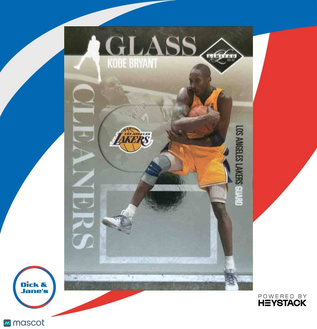 For sale is a rare 2010-11 Panini Limited Kobe Bryant Glass Cleaners trading card. This numbered 27/149 card features Bryant in his iconic Los Angeles Lakers jersey, making it a must-have for any basketball card collector. Don't miss your chance to own a piece of NBA history! Listed With Mascot.
