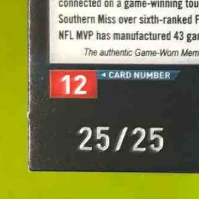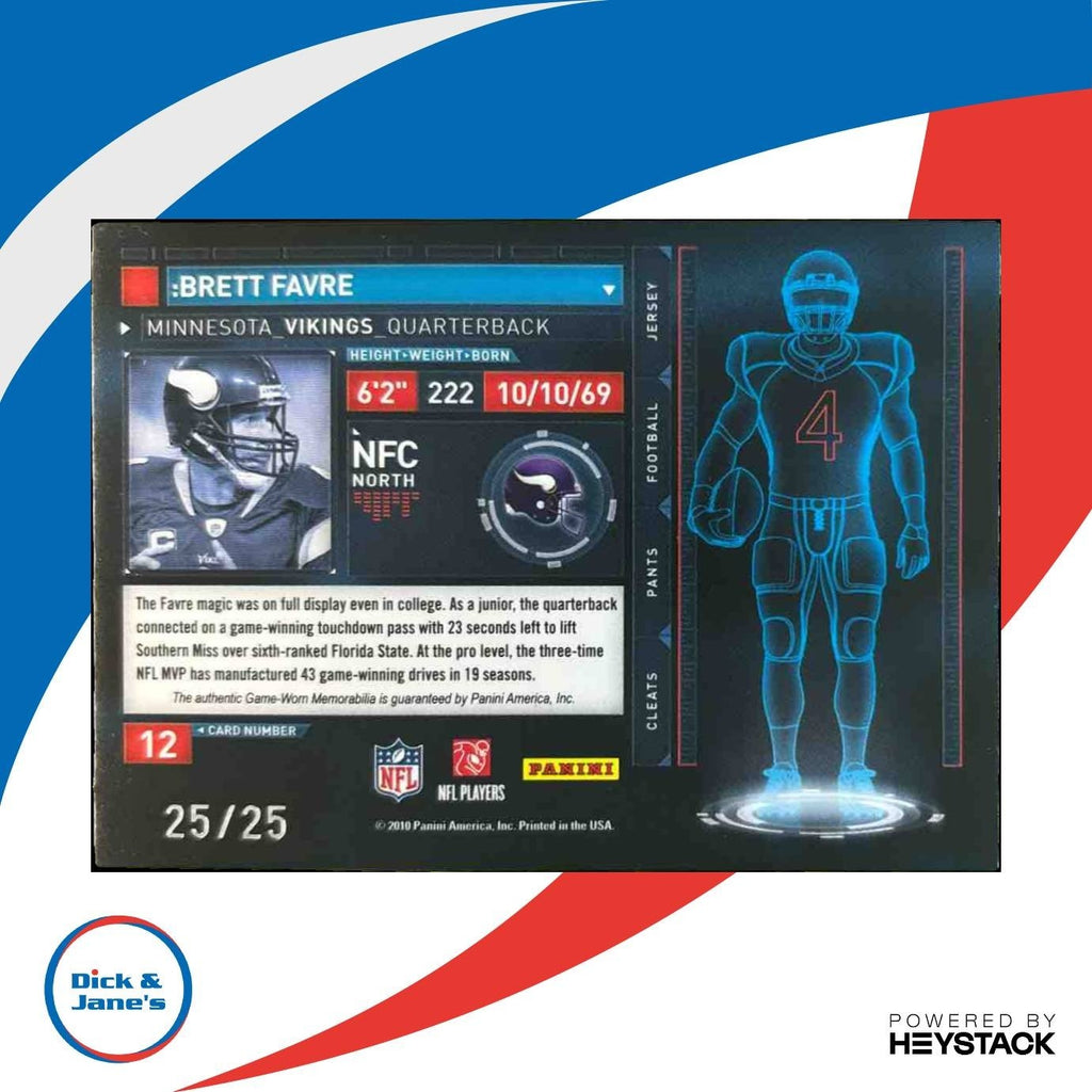 This rare 2010 Brett Favre Vikings trading card features two game-used jersey swatches, limited to only 25 made. A sought-after addition to any NFL card collection, showcasing one of football's greatest quarterbacks. Don't miss out on owning this high-value piece of sports memorabilia. Listed With Mascot.
