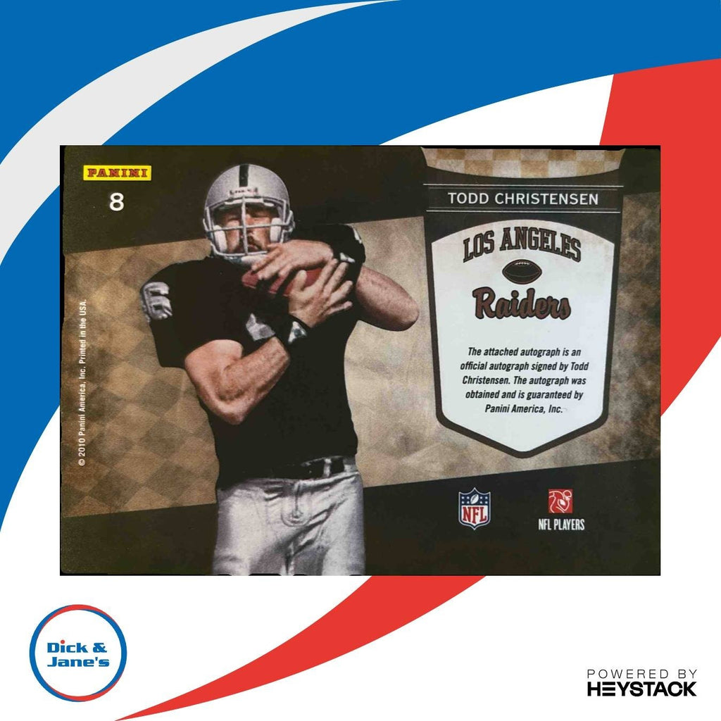 Own a piece of NFL history with this 2010 Panini Playoff Contenders Todd Christensen Legendary Auto #8 Raiders trading card. This rare card features an authentic autograph from the legendary player himself. A must-have for any football collector or fan. Don't miss out on this unique piece of sports memorabilia! Listed With Mascot.